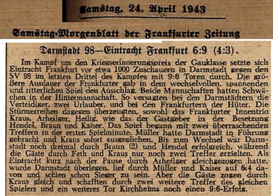 Tore: 1:0 Müller (1.), 1:1 Kraus (2.), Braun, Hendel; Feth, Kraus. 2. HZ: 4:4 Arheilger, Müller, Kaiser; Kraus (3), Kirchheim