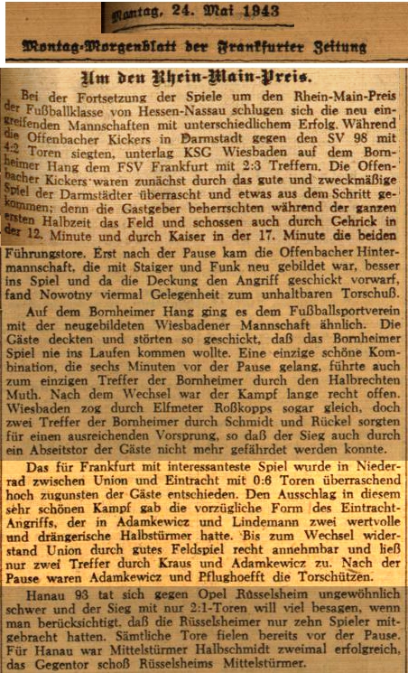 Termin: 23.05.1943 Zuschauer: Schiedsrichter: Tore: Kraus, Adamkiewicz, Pflughoefft >> Spielbericht <<