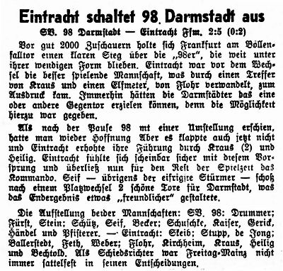 Tore: Alfred Kraus (3), Flohr, Werner Heilig; Darmstadt: Seib (2) (andere Torschützen bei der Frankfurter Zeitung)