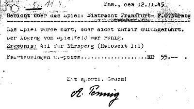 Eintracht - 1. FC Nürnberg 1:4 In den Spielen der Süddeutschen Oberliga haben jetzt drei Vereine, VfB Stuttgart, 1. FC Nürnberg und München 1860, mit je 4:0 Punkten die Führung vor Stuttgarter Kickers und SV Waldhof mit je 3:1 Punkten inne. In Frankfurt siegte der 1. FC Nürnberg gegen die Eintracht 4:1. Die erste Halbzeit war noch ziemlich ausgeglichen und endete auch 1:1. Dann erst fanden sich die Nürnberger, die vor allem ausgezeichnete Flügel besaßen, und errangen einen eindeutigen Sieg, der durch die gute Arbeit Henigs nicht noch höher ausfiel. (aus der 'Frankfurter Rundschau' vom 13.11.1945)