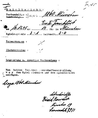 Süddeutsche Oberliga München 1860 siegte gegen Eintracht Frankfurt 3:1. Jahr [?] und Bachel (2) hatten den Münchenern bis Halbzeit einen 3:0-Vorsprung verschaffen können. Nach der Pause wurde Münchens bester Spieler, Bachel, verletzt, die Eintracht kam auf und erzielte durch Arheilger ein Gegentor. (aus der 'Frankfurter Rundschau' vom 18.12.1945)