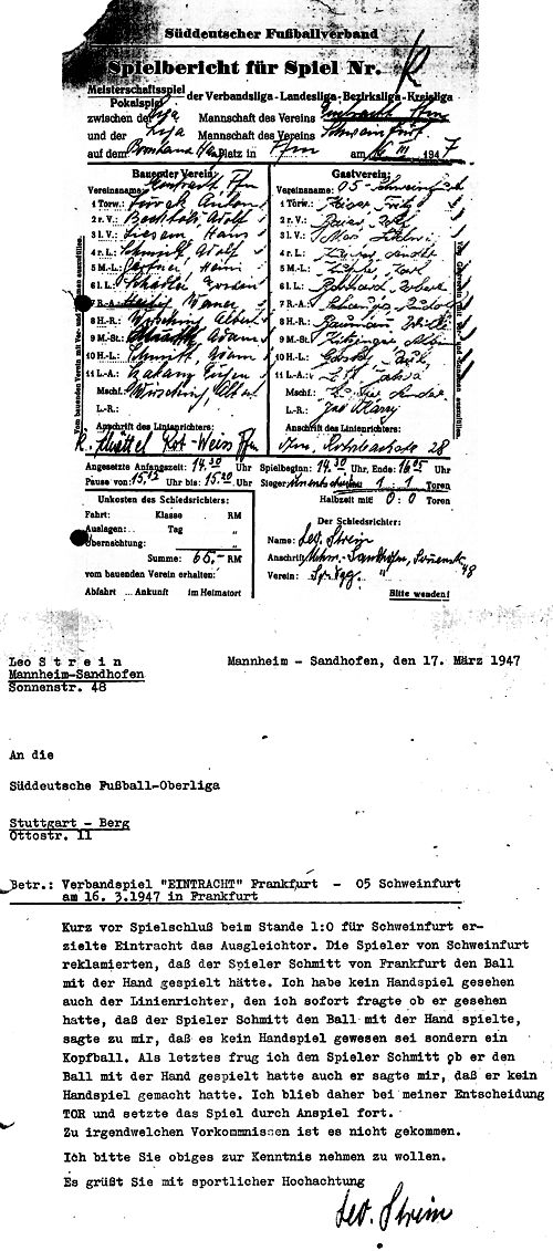 Ein umstrittenes Tor Die Frühlingsluft hatte gestern 12000 Fußballanhänger mobilisiert. Sie standen und saßen am Bornheimer Hang (die Verwegensten hoch in den Bäumen), um die lang entbehrte Fußballkost zu genießen. Das weiche, regenschwere Spielfeld machte es den Kämpfenden schwer. Die robusten und härteren Schweinfurter setzten sich bis zur Grenze des Möglichen ein und nahmen das Unentschieden mit ins Bayernland. Es war ein Tag der Verluste! Ein Mann hatte die Brieftasche verloren, ein anderer die Geldbörse (eine mit beträchtlichem Inhalt wurde gar „abgegeben"), ein entlaufener Drahthaarfox wurde eingefangen. Verloren ging auch ein Punkt für die Eintracht, ein sehr wichtiger Punkt (siehe Münchener Ergebnis!). Die Rotschwarzen waren überlegen. Wie so oft. Sie hatten einen flinken Sturm aufgeboten, einen Sturm der Leichtgewichte. Vielleicht fehlte doch der Brecher Adamkiewicz, um die Schweinfurter Läuferreihe aufzureißen. Muth konnte es bei allem Eifer nicht. An Wirsching hingen oft zwei Gegner, und Adam Schmidt war zu oft in „Privatkämpfe" mit Ander Kupfer verwickelt. Die Außen waren bei Beier-Merz gut behütet. Alles Drängen der Läufer, mitunter gar der Verteidiger war umsonst. Ja, das gefährliche Aufrücken kostet in der zweiten Hälfte ein Tor! Gorsky hatte sich auf der linken Seite durchgesetzt, und seine Flanke schlug der grünweiße Rechtsaußen Schaupp ins Netz. Der Ausgleich ließ nicht lange auf sich warten! Adam Schmidt lenkte einen Strafstoß Gärtners ins Tor! Die Massen jubelten, aber die gesamte Schweinfurter Mannschaft „bestürmte" minutenlang den Unparteiischen Schrein (Mannheim). Adam hatte nämlich den Ball ... mit der Hand ins Tor gespielt. Das sah man auch auf den Rängen. Der Unparteiische aber blieb bei seiner Entscheidung ... und Eintracht behielt ein glückliches Tor! ('Frankfurter Neue Presse' vom 17.03.1947)
