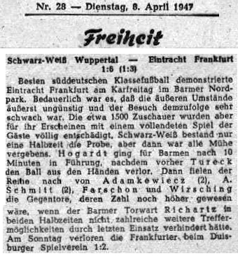Zwei Siege in drei Spielen Die Frankfurter Eintracht hatte des Guten etwas zu viel getan: drei Spiele innerhalb von drei Tagen neben der Bewältigung der aufreibenden Punktspielrunde im Süden. Das war starker Tobak. Den Auftakt bildete der beifallumdröhnte 6:1-Sieg gegen Schwarz-Weiß Barmen am Karfreitag. Bereits beim Wechsel hieß es 3:1 für die Gäste vom Main, die den Barmern mit ihrem Flachpaß-Kombinationsspiel überlegen waren. Die Eintrachtler wirkten in diesem Treffen offensichtlich mit dem „zweiten Gang", um sich für die noch ausstehenden Treffen zu schonen. (aus 'Der neue Sport' vom 08.04.1947)