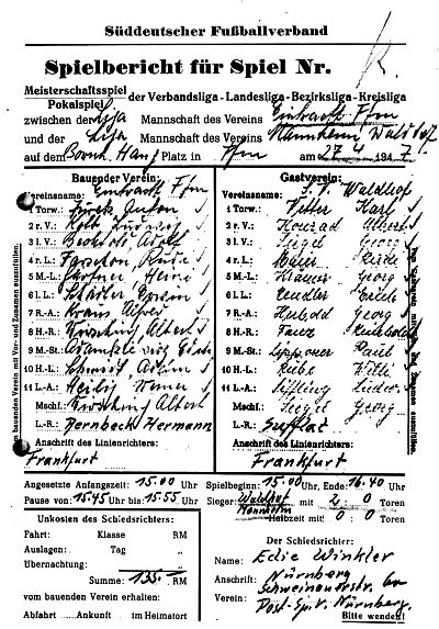 Waldhof immer noch Klasse Eintracht — Waldhof 0:2 Nur die wenigen, die sich auch an der Leistung des Gegners begeistern können, wurden hier, ganz zufriedengestellt. Man sah wohl die Fehler der eigenen Mannschaft, aber wie viele sahen, daß hier eine Klasseelf siegte? Eine Mannschaft voll Feuer und Temperament, mit wundervollem Kombinationsspiel und mit eines Sturmreihe, wie man sie sich auch einmal für einen Frankfurter Verein wünschen möchte. Das ging ruck-zuck von den Flügeln in die Mitte und wieder nach außen, die Schüsse kamen aus allen Lagen. Freilich, man hatte gehört, daß dieser Lipponer nicht der richtige Mittelstürmer wäre, und hier glänzte er ganz besonders. Lag es vielleicht daran, daß Gärtner an diesem Tag seinen Mann zu decken vergaß — vor allem, als es 1:0 stand? Es war so, daß der junge Bechtold an diesem Tag in überragender Weise verteidigte, ohne ihn wäre wahrscheinlich eine hohe Niederlage herausgesprungen. Die kleinen Fehler, die hie und da in der Deckung der Eintracht zu beobachten waren, schienen gewiß nicht entscheidend, denn Turek war an diesem Tag ein überlegener Meister des Strafraums, der durch gutes Stellungsspiel mit den wenigsten Schüssen auch nur Mühe zu haben schien. Dagegen wirkte der Sturm der Frankfurter matter denn je. Mit der einen Ausnahme von Wirsching, der sich Mühe gab und, obwohl er aufmerksam gedeckt war, manche gute Chance herausarbeitete; es war sein Pech, daß er mehrfach in bester Schußgelegenheit dann doch nicht die Konzentration hatte, um das naheliegende Führungstor zu schießen. Aber die anderen! Adam Schmitt hatte in der Wärme keine rechte Spielfreude, Heilig war gegen Konrad machtlos, Adamkiewicz war frühzeitig durch eine Zerrung gehemmt, und Bubi Kraus kam überhaupt nicht ins Spiel. Immer wieder machten die Frankfurter den Fehler, zu spät zu starten oder gar hinter dem Deckungsspieler auf den Ball zu warten. Mit dieser Spielweise war nichts zu erben, denn diese Waldhöfer sind ebenso ballsicher wie die Eintracht. Sie waren nur außerdem schnell und kämpferisch. Die Eintracht begann mit zwei flinken Durchstößen, aber bald setzte sich das bessere Mannschaftsspiel des Gegners durch, dem die Eintracht ziemlich temperamentlos zusah. Einmal mußte Schädler im letzten Augenblick eingreifen. Es blieb, vor allem dank Bechtold und Turek 0:0 bis Halbzeit. Nach der Pause sah es so aus, als hätte die Eintracht sich geschont, um jetzt vielleicht Versäumtes nachzuholen. Es war noch nicht zu spät! Heilig stand einmal (Fehler von Konrad) völlig frei, verschoß aber, und dann war Wirsching allein dicht vor dem Tormann, konnte aber mit Schuß und Nachschuß den ausgezeichneten Vetter auch nicht überwinden. In der 13. Minute gingen die Mannheimer, sehr glücklich übrigens, in Führung, denn Gärtner trat ohne Gegner frei über den Ball, so daß hinter ihm Lipponer mit Muße einschob. Gärtner ging jetzt in die Offensive, aber Waldhof hatte wieder Oberwasser, Bechtold wehrte einmal am leeren Tor, im Fallen köpfend, ein sicheres Tor, aber in der 27. Minute fiel das entscheidende Tor nach schönem Zusammenspiel Lipponer-Herbold, geschickt durch viele Beine in die Ecke gezielt. Das Spiel hatte 12.000 Zuschauer. Schiedsrichter war Winkler-Nürnberg, der zwar einige Einzelfehler machte, aber beide Mannschaften doch gut in der Hand hatte. Es ging übrigens im Spielfeld wie auch drum herum anständig zu. Erich Wick. (aus 'Der neue Sport' vom 28.04.1947)