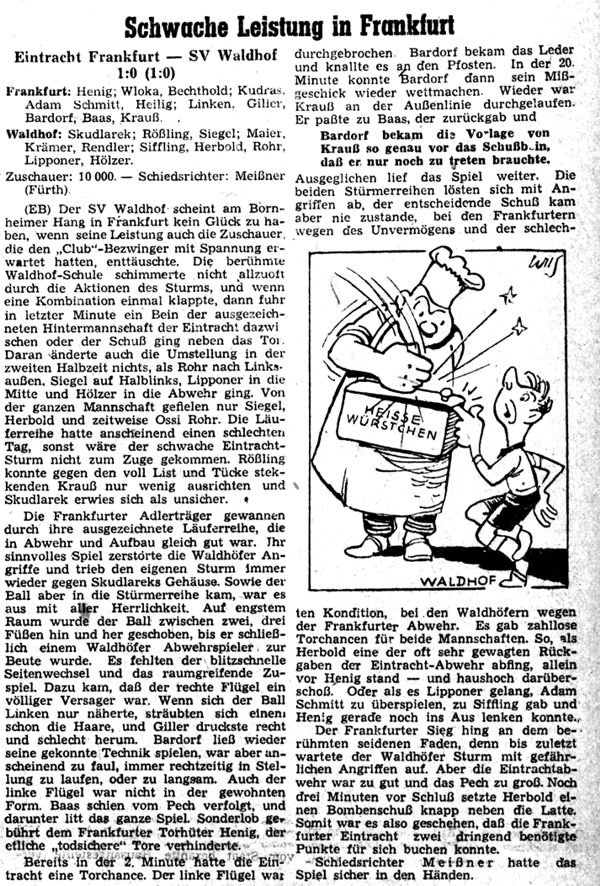 aber die gesamte Im ersten Akt lief das Waldhofspiel mitunter schön und fließend. Ossi Rohr gab aus der Mitte einige bildschöne Vorlagen und Lipponer ging mit Elan und Unternehmungsgeist uns Werk, aber das war bald vorbei. Der in den Hüften recht füllig gewordene Rohr hatte sich bald ausgespielt und Lipponer fand in Kudras einen Gegner, der ihm keinen Meter Raum zuviel ließ. Da auch Heilig eine ganz ausgezeichnete Partie lieferte und Herbold im Mittelfeld völlig ausschaltete, da Wlocka und Bechtold die Außen Siffling-Hölzer sicher hielten und Adam Schmidt sich in der Mitte auf kein Risiko einließ, blieb dem Tormann Henig nicht allzuviel zu tun übrig. Als den Waldhöfern einmal durch ein schlechtes Rückspiel eine Riesenchance erwuchs, verschoß Herbold in schier unmöglicher Weise (was sich dann aus anderem Anlaß, wenn auch nicht so drastisch, noch zweimal wiederholte). Zum Glück für die Eintracht, die nicht mehr als zu einem Treffer kommen konnte, weil Ihr rechter Flügel — in der Besetzung Linken-Giller — ein Ausfall war und Bardorf im Zentrum zuviel Konditionsschwächen aufwies, um sich in entscheidenden Momenten durchsetzen zu können. Für Siegl gab es unter diesen Umständen keine Probleme. Er beherrschte ganz überlegen seinen Raum bis tief in die Mitte hinein. Krämer war es dadurch möglich, sich auf Baas zu konzentrieren, dem Mayer zuviel Spielraum ließ und Krauß hatte gegen Rößling zwar gute Momente, aber wenig Glück. Schiedsrichter Meißner (Fürth) leitete einwandfrei. (aus dem 'Sport-Magazin' vom 24.11.1948)
