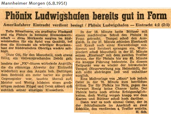 Tempel-Tore im Phönix-Wirbel Der regenfeuchte, spiegelglatte Rasen des Südwest-Stadions ermunterte die Eintracht zu einer Wiederholung ihrer Kölner Glanzpartie vor der Sommerpause. Aber es wurde nichts daraus. Pfaff mißlangen gleich in den ersten Minuten einige Aktionen und von da an mimte er mehr elftes Rad am Wagen als Kutscher. Er stand zumeist tatenlos im Felde herum, spielte fast jeden Ball dem Gegner in die Füße und rappelte sich erst gegen Schluß eines für den Saisonbeginn unerwartet lebhaften, schmissigen und aufregenden Treffens zu einigen Sololäufen auf, die seiner Klasse würdig waren. Da auch Schieth nicht gerade festlich aufgelegt war und Heilig sich wieder einmal partout nicht vom Leder trennen wollte, gehörte das Mittelfeld zumeist den spurtschnellen, überraschend geschickt kombinierenden und unerwartet schußfreudigen Pfälzern, deren Außenläufer Büttner und Gläser die schwache Verfassung von Pfaff und Schieth weidlich zu ihrem Vorteil auswerteten. Pech für die Eintracht war es, daß Bubi Kraus, bis dahin mit den beiden Neuerwerbungen Geier und Tempel der aktivste und gefährlichste Stürmer der Frankfurter, nach einer halben Stunde vom Felde getragen werden mußte, weil er sich bei einem ungewollten Zusammenprall mit Torwart Eberhard, der ebenfalls kampfunfähig wurde, eine schwere Knieverletzung zuzog. Reichert gab sich als sein Ersatzmann wohl größte Mühe, aber sein Zuspiel war ebenso unüberlegt und ungenau wie das der beiden Halbstürmer, so daß praktisch die Eintracht nur mit zwei vollwertigen Stürmern operierte. Damit aber war gegen die Ludwigshafener kein Blumentopf zu gewinnen, zumal da Mantel und Blesch als Bewacher von Geier und Tempel in blendender Kondition waren. Geier forcht sich jedoch nicht, flankte und schoß wie ein Alter, und Tempel bewies mit zwei Prachttoren und einigen klugen Vorlagen, daß die Eintracht mit ihm einen guten Fang gemacht hat. Die große, angenehme Ueberraschung war Krömmelbeins intelligentes Läuferspiel, und Wlocka bewährte sich erneut als wuchtiger, energischer Verteidiger. Gegen ihn verblaßte Bechtold als Stopper und auch Kudras als zweiter Verteidiger. Henig reagierte nicht immer schnell genug. Der zweite und dritte Erfolg der Pfälzer schienen jedenfalls nicht unhaltbar zu sein. Das Leder spielte beiden Mannschaften zuerst manchen Streich, da es durch die Bodenglätte unheimliche Fahrt bekam, aber da just mit dem Anpfiff des Spiels ein Gewitterregen wieder von schönstem Sonnenschein abgelöst wurde, akklimatisierte man sich zusehends besser und spielte sich in eine streckenweise geradezu mitreißende Form hinein. Büttners Bodenflitzer aus dem Hinterhalt egalisierte Tempel mit einem Gewaltschuß, nachdem Pfaff ihn endlich einmal sauber bedient hatte, und als ein neuer Flachschuß Mazzuchellis von der Strafraumgrenze Henig zu spät zu Boden gehen sah, kämpfte sich Tempel allein durch und zog mit überlegtem Schuß zum zweitenmal gleich. Zwei Prachtschüsse Osters sicherten zuletzt den Pfälzern aber doch den wohlverdienten Sieg, Er wird Pfaff und Schieth gezeigt haben, daß es ohne Energie und Elan nicht geht — vor allem nicht im Kampf mit ehrgeizigen Gegnern. (aus 'Der neue Sport' vom 06.08.1951)