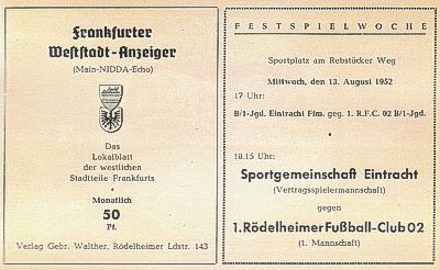 Eintracht-Sieg erst nach der Pause FC Rödelheim - Eintracht Frankfurt 0:2 (0:0) Die Frankfurter Eintracht war der Dritte im Bunde derjenigen Großvereine, die aus Anlaß des 50jährigen Jubiläums des 1. FC Rödelheim Freundschaftsspiele am Rebstöcker Weg austrugen. Allzuviel von freundlich-mildem Geist war in dem Mittwochabendspiel, das die Eintracht verdient mit 2:0 gewann, nicht vorzufinden, denn es gab hüben und drüben Verletzte -. Die Eintracht begann mit Kirchheim als Mittelläufer und dem Ex-Oberräder Hesse in der rechten Verbindung. Aber in der ersten Halbzeit klappte es nicht recht, und zudem war der Rödelheimer Torhüter Klug wieder bester Mann seiner Elf. Nach Seitenwechsel, als man Jänisch in die Mitte nahm und Reichert am rechten Flügel stürmte, kam etwas mehr Leben in die Fünferreihe. Pfaff schoß in der 60. Minute das erste Tor. Zwölf Minuten später wurde er leicht verletzt und schied aus. Eine Minute vor Spielende gelang Schieth mit unhaltbarem Flachschuß der 2. Treffer. --- Die ägypische Olympia-Fußballmannschaft, die am Sonntag in Frankfurt gegen die Eintracht spielt, bewies am Mittwoch durch einen 4:3-Sieg gegen Fortuna Düsseldorf ihre Stärke. (aus 'Frankfurter Neue Presse' vom 14.08.1952)