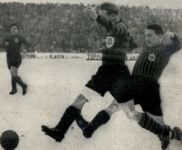 Hatten sie zu viel Respekt voreinander? Deckungen durch Stürmer verstärkt Frankfurts neuer Verteidiger-Stern: Niebel! Herrmanns eindrucksvolle Wiederkehr — Eintrachts berühmter Endspurt reichte diesmal nicht zum Sieg .Man hat sich so daran gewöhnt — an das Unentschieden nämlich. Es war ein Derby, dem die Härte und der Einsatz früherer Großkämpfe fehlten. Das lag vielleicht teilweise an der Kälte und an dem harten, glatten Boden, der zur Vorsicht mahnte. Trotzdem waren die klaren Torchancen beim FSV, der nach der Pause sogar die Chance des Tages besaß: Meyer war frei vor dem Tor aufgekreuzt, das Henig verlassen hatte und hätte wuchtig einschießen müssen. Sein Ball war indessen nicht scharf genug getreten, so daß Kudras noch auf der Torlinie wegköpfen konnte. Für das Remis spricht ferner die Tatsache, daß beide Tore nur durch Abwehrfehler möglich waren, das erste durch einen Abschlag, den sich Herrmann eroberte, das zweite durch eine mißglückte Rückgabe von Lurz an Nold, die dieser nicht erwischte. Beim FSV sieht man wieder ein Zusammenspiel, das aus den. hinteren Reihen bis nach vorne dringt. Es wird mit Verstand abgespielt, alles Dinge, die es noch vor Wochen kaum gab. Inzwischen ist die Deckung gefestigt. Der aufopfernde Schwarz hat in Niebel einen Klasseverteidiger hinzubekommen, dessen fabelhaftes Stellungsspiel ihn zum besten Verteidiger Frankfurts stempelt. Auch Nold war besser als vor acht Tagen. Hervorragend zäh und energisch, ist Lurz geworden. Dazu kommt die gute Form Rados, der alle Unsicherheiten abgestreift hat. Im Sturm waren die beiden Flügel wenigstens vor Halbzeit gut. Sie bestimmten das Spiel, und wenn Schuchardt seinen Außen Herrmann so bedient hätte wie zu Anfang, wäre ein Sieg möglich gewesen. Denn Herrmann war, obwohl er zum erstenmal nach seiner Verletzung wieder antrat, ganz der Alte. Kunkel und Meyer verstanden sich ebenfalls gut, und Meyer geht immerhin an den Mann. Die Drei-Verteidiger-Reihe war nicht ganz frei von Unsicherheiten. Beachtlich die Leistungssteigerung der Eintracht in den letzten Minuten, die den Riederwäldern so oft geholfen hat, ein Spiel noch in letzter Sekunde zu gewinnen. An diesem Tag freilich war der Endspurt, so gut er war und obwohl er fast alle Spieler mitriß, nicht ausreichend, die starke Abwehr des FSV aufzubrechen. (aus dem 'Kicker' vom 09.02.1953) |