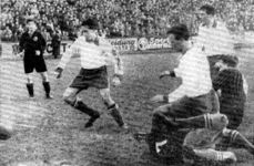 Trotzdem sah man den Dingen beruhigt entgegen, denn das Mittelfeld beherrschten Remlein und Kreß. Remlein war an diesem Sonntag ein Zauberer, er schüttelte die Vorlagen wie Knecht Rupprecht die Geschenke aus dem Sack. Kreß riß mit seinen Explosivvorstößen die Augsburger Abwehr auseinander, und die Gäste hatten etwas Glück, daß sie so lange von Einschlägen verschont blieben. So als Bäumler einen Schnitzer Hofstetters prompt ausnutzte und der Schuß von Schmids ausgestrecktem Fuß abprallte. Auf der anderen Seite ging Loy rechtzeitig zu Boden, als Müller einen gefährlichen Schuß vom Stapel ließ. Man mußte 36 Minuten auf das 1:0 warten. Schmid war mit dem Ball zu lange gelaufen. Schiedsrichter Fiershauser verhängte in der Nähe des Elfmeterpunktes einen indirekten Freistoß, was die Augsburger veranlaßte, acht Spieler auf ihre Torlinie zu stellen. Ein vergebliches Bemühen, denn den von Kreß angetippten Ball jagte Pfaff ins Netz. Foul oder nicht foul? Zwei Minuten später köpfte Kreß mit einem mächtigen Satz den Ball ein. Fiershauser deutete zuerst zur Mitte, gab dann der Reklamation eines Augsburger Verteidigers nach und wertete diesen Treffer nicht, weil Kreß angeblich Torwart Schmid behindert haben sollte. Nach unserer Beobachtung war Schmid aber mehr von seinem eigenen Verteidiger bedrängt worden. Nun, diese Enttäuschung machte Kreß in der 51. Minute wett. Geltl hatte eine Flanke Weilbächers schlecht weggeschlagen, sofort startete Kreß mit dem Ball los, und sein Sturmlauf endete im Augsburger Tor, während zwei Verteidiger und der Torwart betrübt am Boden hockten. Dieses explosive Tor riß die Nebenleute mit. Auf einmal ließ sich Bäumler von Hochstetters Können und Härte nicht mehr beeindrucken. Auf einmal kam der rechte Flügel gut zum Zuge. Die Augsburger kamen kaum mehr aus ihrer Hälfte heraus und verteidigten mit dem Mut der Verzweiflung ihren Strafraum. Doch viele Beine sind des Stürmers Tod. Aus den gut zwei Dutzend Chancen entstanden nur zwei Tore. Teils wurde zu ungenau gezielt, teils konnte immer wieder ein Augsburger Abwehrspieler sein Bein in die Schußbahn bringen. Das Eckenverhältnis stieg auf 11:1, aber der Zusammenbruch der Gäste stellte sich erst spät ein. Die Abwehrschläge wurden immer schwächer, die Bewegungen immer matter. Als Pfaff in der 84. Minute einen Strafstoß vor das Augsburger Tor hob, schraubte Weilbächer sich förmlich hoch und stieß den Ball mit dem Kopf ins Netz. Im Abwehrgetümmel erwischte Bäumler dann das Leder, und Schmid war zum vierten Male geschlagen. Der Schlußpfiff erlöste die Augsburger vom grausamen Katz- und Mausspiel. Schiedsrichter Fiershauser (Karlsruhe) traf mit dem aberkannten Tor eine Fehlentscheidung. Irren ist menschlich, aber warum ließ er sich dann zu Konzessionen verleiten, um dann später der anderen Seite wieder Konzessionen zu machen? (aus 'Der neue Sport' vom 06.12.1954)