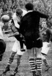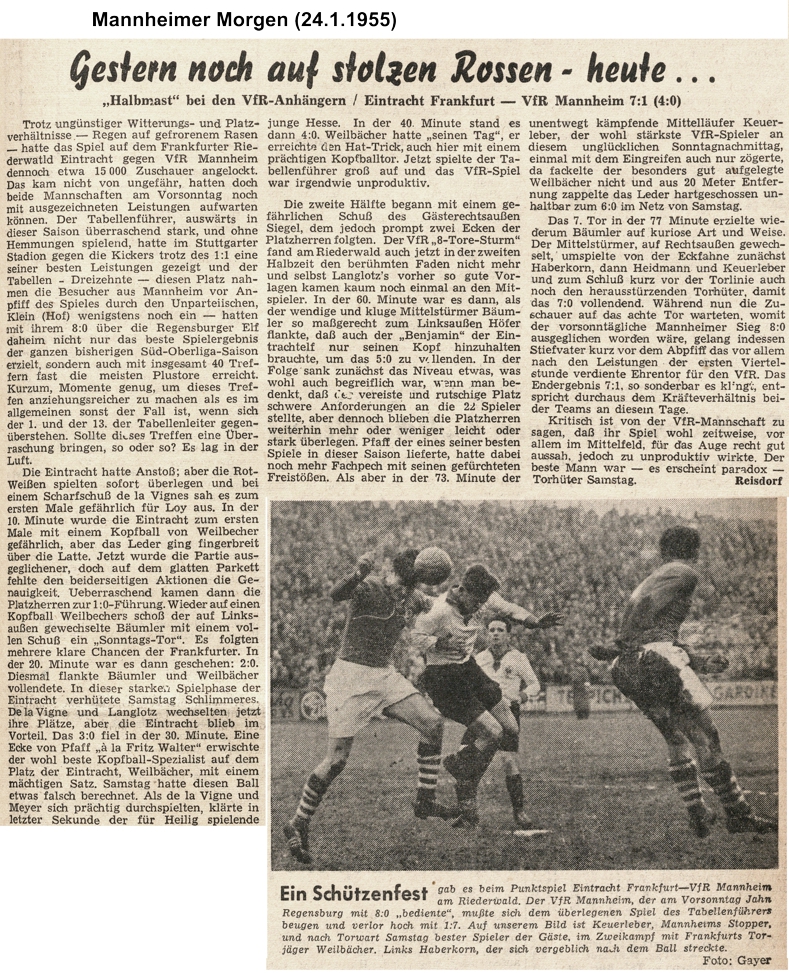 Bilderbuchtore am Riederwald Schützenkönig Weilbächer Die Presse muß sachlich bleiben und sich jeglicher Anerkennungs- oder Mißfallensäußerung enthalten. Doch diesmal hörte man auch bei ihr anerkennendes Gemurmel. Man möge dies verzeihen. Die Tore, die man zu sehen bekam, waren zum Teil so schön, daß der Chronist gerne auf eine javanische Reistafel zeitlebens verzichten möchte, wenn er immer solche Tore zu sehen bekommt. Die anderen Treffer waren nicht weniger schön, doch diesen drei Toren sei die Krone der Anerkennung gewährt. Bäumler hatte den Torsegen auch eingeleitet, als er den Ball an den Pfosten pfefferte, von wo er in die andere Torecke sprang. Weilbächer schoß den zweiten Treffer, obwohl von Haberkorn hart bedrängt, Höfer gelang gleichfalls ein weiteres Kopfballtor, als die Mannheimer Weilbächer genau abgeschirmt hatten und Bäumler einen Freistoß stark vor das Mannheimer Tor hob, und schließlich donnerte Weilbächer noch einmal den Ball mit Vehemenz unter die Mannheimer Latte. Stiefvaters Gegentreffer, in der vorletzten Minute erzielt, wirkte neben diesem siebenfachen Torsegen wie ein milder Hustenbonbon. Pfaff in bester Laune Wie war es möglich, daß die Eintracht den VfR so ausspielte? Einen VfR, der immerhin acht Tage zuvor Regensburg 8:0 besiegt hatte. Es war möglich, weil sich die Eintracht in eine Form hineinspielte, wie wir sie schon lange nicht mehr bei ihr gesehen haben. Das Geheimnis dieser Steigerung aber ist rasch gelöst: Es liegt begründet in einer Umstellung in der Deckung und in Alfred Pfaff. Man hatte auf Werner Heilig verzichtet, dem der schwere Boden einfach nicht liegt. Für ihn spielte Kudras Läufer und dieser Kudras schaffte neunzig Minuten lang die Bälle großartig aus der eigenen Hälfte nach vorne. Daß er dazu den sechsfachen Torschützen (gegen Regensburg) Meyer zu beschatten hatte, machte Kudras nicht viel aus. Bei seiner Kondition schaffte er das so nebenbei. Da Kudras jedesmal zurückging, wenn die Mannheimer angriffen, konnte sich Remlein wieder mehr um die Offensive kümmern. Wer Alfred Pfaff gegen diie Kickers gesehen hatte, erkannte ihn gegen den VfR nicht mehr wieder. Pfaff spielte so, als säße nicht ein Herberger, sondern säßen sechs Herberger auf der Tribüne (und dabei war Herberger überhaupt nicht am Riederwald!). Von der ersten bis zur allerletzten Minute setzte er sich mit einem Eifer ein, daß die Mannheimer Abwehr immer wieder vor unlösbare Aufgaben gestellt wurde. Wer will den Eintrachtsturm halten, wenn der Pfaff neunzig Minuten (und weiterhin so) spielt? Doch auch Kudras und Pfaff waren im Grunde nur Werkzeuge, Werkzeuge in einer reibungslos laufenden Eintracht-Maschine. Loy hatte es nicht allzu schwer, Bechtold stellte sich rasch auf Schönig ein und Hesse ließ den flinken Siegel nicht aus den Augen. Wenn man bei Hesse etwas bemängeln konnte, so waren es seine etwas schwachen Abschläge. Doch wer wollte bei diesem schweren Boden viel rechten. Wlokas Dazwischenfahren raubte dem Techniker Langlotz bald die Laune und die Uebersicht, von Remleins und Kudras Rollen war schon die Rede. Kreß zu ballverliebt Im Sturm fiel, genau genommen, nur Kreß etwas ab, ihm fiel bei nassem Boden die Ballbehandlung etwas schwer. Zum Angelpunkt des Sturmes hat sich in den letzten Wochen Bäumler entwickelt. Seine Flanken und Vorlagen bereiteten den anderen die Torschüsse vor. Keuerleber stand gegen Bäumler auf verlorenem Posten, zumal er es vorzog den Raum zu decken, und viel zu hüftsteif geworden ist. Weilbächers Explosivität feierte mit vier Treffern wahre Triumphe. Sein Torinstinkt, seine Sprungkraft und seine Kopfballtechnik waren mit eine Vorbedingung für diesen, allen unerwarteten Torsegen. Neben Weilbächer lebte Höfer an diesem Sonntagnachnnittag förmlich auf. Nur zehn Minuten lang hatten die Mannheimer mit ihrem Kurzpaß das Mittelfeld beherrscht und die Frankfurter Abwehr ernstlich beschäftigt. Der erste Eintrachttreffer löste eine Lawine aus, in der die immer hilflosere VfR-Abwehr rettungslos versank. Samstag trat einmal zornerfüllt den Ball noch einmal ins Netz und Keuerleber schüttelte immer wieder traurig den Kopf. Achtzig Minuten unter Druck, achtzig Minuten einfach keine Möglichkeit, einmal eine Gegenoffensive aufzubauen, das hält der Stärkste nicht aus. Schiedsrichter Klein war nicht schlecht, nur stand er mit der Vorteilsregel auf dem Kriegsfuß. (aus 'Der neue Sport' vom 24.01.1955) |