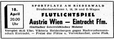 Die Eintracht noch „aus tausend Wunden blutend", kam den Gästen weitgehendst entgegen. Sie deckte den Raum statt den Mann. So ähnlich müssen es Austrias Gegner an der Donau wohl auch tun. Man nützte die Freiheiten mit Wollust, kombinierte kreuz und quer, im Kreise herum, und immer stand jemand frei. Manchmal klaffte zwischen Eintracht-Sturm und Deckung ein Loch wie beim Handball. Wer als einzelner in die Mahlsteine der Austria-Mühle geriet, war rettungslos verloren. Schymik ging es so, weil er praktisch vom Krankenbett aufs Spielfeld kam und gar keine Kondition hatte. Eigenbrodt, dem anderen Seitenläufer, weil sein Hintermann, Adolf Bechtold, seit Jahr und Tag ein Anhänger der Raumdeckung ist. Wenn die Eintracht-Halbstürmer Kreß und Pfaff sich in Deckungsaufgaben erschöpften, genügte ein Stopper vom Format von Stotz, um die verbliebenen Angreifer in ihre Schranken zu weisen. So machten die Wiener sich streckenweise zwischen Mittellinie und Frankfurter Strafraum mit ihrem Scheiberlspiel breit, ohne oft in den Rücken der Eintracht-Abwehr zu geraten. "Der liebe Herrgott wird schon mal für ein Tor sorgen." Er sorgte für zwei, einmal durch Baumgartner, den eine Steilvorlage erreichte, ehe Höfer, der, etwas draußen, gerade einen Freistoß getreten hatte, wieder zurück und Loy am Elfmeterpunkt war. Ein zweitesmal durch Fischer, der mit einem Schuß aus der Drehung aus kürzester Distanz Bechthold II, Schymik und Loy ein Schnippchen schlug. Ansonsten war die Eintracht, die durch Meyers Kopfball auf Weilbächers Flanke von der Eckfahne zum Ausgleich gekommen war, in der Hälfte der Angriffszeit gefährlicher als die Wiener. Viele Ecken viele gute Schüsse von Pfaff, je einmal von Kreß und Weilbächer. Aber meistens stand Schweda wie aus der Erde gewachsen, an der richtigen Stelle. Den schönsten Schuß aber hatte er von Eigenbrodt zu meistern, der gut gefiel. Vielleicht heißt das Außenläuferpaar der Riederwälder einmal Wehner (in Urlaub) — Eigenbrodt. Im Sturm geht es nicht ohne Geiger und Bäumler. Weilbächer als vorgeschobener Mittelstürmer erreicht niemals die Wirkung wie im Mittelfeld. Kreß noch nicht in „Flutlichtform". ( Bert Merz in 'Der neue Sport' vom 23.04.1957)