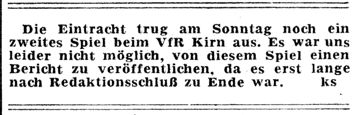 Zwei Eintracht-Siege an der Nahe He. - Die Frankfurter Eintracht kehrte von ihrer Fußballreise an die Nahe ohne Niederlage wieder in die Mainmetropole zurück. Am Samstag blieb man bei der Kreuznacher Eintracht knapp 3:2 erfolgreich und einen Tag später sahen die Zuschauer in Kirn ein torreiches Treffen, das 7:5 für die Riederwälder endete. Erfolgreichster Torschütze war wieder einmal Feigenspan mit insgesamt fünf Treffern. [...] VfR Kirn - Eintracht 5:7 Die Eintracht ließ gegen den Zweitdivisionär die vom Samstagsspiel leicht angeschlagenen Pfaff und Maier pausieren und gab dem Jugendspieler Lutz für A. Bechtold eine Chance. Die Eintracht spielte für das Auge einen begeisternden Fußball und lag ständig in Front. Die Deckung der Frankfurter war aber in der 2. Hälfte allzu sorglos und mußte so fünf Gegentore hinnehmen. Hesse unterlief beim Stand von 5:2 ein Eigentor. Torschützen des Gastes: Feigenspan (3), Lindner (2), Kreß und Bäumler. Da die Frankfurter Eintracht zum Brackweder Jubiläumsspiel abgesagt hat, spielt nun Rotweiß Essen am 30. Juni gegen den 16maligen türkischen Fußballmeister Fenerbace Istanbul. (aus 'Frankfurter Neue Presse' vom 24.06.1957)