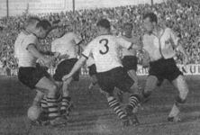 Der Torregen am Riederwald Die große Schau Eintracht — Hof 11:0 (4:0) Am Riederwald sahen viele auf die Uhr: eine halbe Stunde und noch kein Tor! Beim Schlußpfiff waren es elf Treffer und ohne den kleinen Kästner im Bayern-Tor wären es... Lassen wir es! Denken wir daran, nichts über- und nichts unterzubewerten. Darum möchte ich behaupten, daß die Hofer nicht absteigen! Sie gerieten in der zweiten Hälfte in eine Mühle, in der sie durchgedreht wurden und keinen Ausgang mehr fanden. Das ist schon ganz anderen Mannschaften in diesem Sommer passiert. Werder Bremen, FK Pirmasens, Karlsruher SC! In der Differenz der Bremer, Pirmasenser und Karlsruher Niederlagen zum 0:1 der Hofer liegt die mangelnde Erfahrung des Neulings begründet. Vielleicht noch Konditionsschwäche. Ansonsten wird es niemand wundern, wenn die Bayern von der Zonengrenze in wenigen Wochen eine ganz normale Oberligamannschaft werden. Die Eintracht hatte eben ihren Tag, wenn dieser Tag auch nur eine gute Stunde sichtbar wurde. Bis zum ersten Treffer spielte sie, was man landläufig überlegen nennt, aufs Hofer Tor, wo man den kleinen Kästner bewunderte, wie er jeden Eckball und jede Flanke, nach der er ging, sicher faßte. Ein paar gute Schüsse hielt er, ein paar klare Chancen wurden verstolpert. Es war bis dahhin nichts Außergewöhnliches, was geboten wurde. Die Zuschauer, im letzten halben Jahr restlos verwöhnt, griffen schon hier und da wieder zum Hausschlüssel, um zu pfeifen. Erst nach der siebten Ecke löste Bäumlers prachtvoller Schrägschuß die Energien aus. In der kurzen Spanne bis zum Wechsel wurde alles entschieden! Mit Toren, die mehr erzwungen und erkämpft als erspielt wurden. Daß dieser Sturm, trotz VfR-Mannheim-Spiel, der beste der Eintracht ist, wurde jedem klar. Mit Kreß wuchsen Lindner und Pfaff in eine geradezu fröhliche Spiellaune, in der sie begeisternd schöne .Tore schossen. Und daß Bäumler seinen größten Grad an Zuverlässigkeit erreicht, wenn er neben Pfaff steht, braucht nicht mehr besonders betont zu werden. Mit seinen drei Treffern rückte er mit sechs Torerfolgen zu Erwin Stein auf, der Pech hatte, daß Kästner seine besten Schüsse hielt und er außerdem einmal das leere Tor nicht fand, als ihn Kreß freispielte. Aber seine beiden Treffer vor der Pause hätte vermutlich keiner der Techniker um ihn herum erzielt. Sie erforderten das letzte Hineinbrechen in die gegnerischen Sperren rings um ihn. Das schönste Tor? Darüber stritten die Zuschauer wohl noch auf dem Heimweg. Lange stand Bäumlers 1:0 als Einzelleistung, aus spitzem Winkel hoch ins lange Eck, obenan. Dann kam das fünfte, wieder von Bäumler, das in der Anlage mit dem weiten Paß Weilbächers und dem Kopfball von Pfaff in die Gasse wie auf Bestellung wirkte nach Pfaffs Aufruf: „los!" Es kamen die Treffer, bei denen der Ball blitzschnell in das Loch in der Mitte geschaukelt wurde, wenn Hörath mit Stein zum Flügel zog, der 20-Meter-Schuß von Pfaff zum 10:0, glanzvoll wie der letzte Erfolg, den Lindner im hohen Bogen haargenau ins lange obere Eck zielte. Es waren Tore, die das Volk zufriedenstellte. Es schmälert die Leistung der Eintracht in keiner Weise, wenn man sagt, daß die Hofer diesen Sack voll Gegentreffern nicht alle verdient hatten. Was wären sie erst geworden, wenn Kästner, der junge Mann, nicht so großartig hinter den brechenden Dämmen gestanden hätte? Oßwald muß mit dem Jungen empfunden haben, als dieser weinend den Platz verließ und der Eintrachttrainer ihn tröstete. In Hörath hatten die Gäste noch einen ganz passablen Mittelläufer, der aber ein Loch hinterließ, wenn er mit Stein auf die Flügel zog. Und in dieses Loch starteten die Eintrachtstürmer prompt hinein. Einmal schossen sie innerhalb von 35 Sekunden zwei Tore, wie überhaupt dreimal zwei Tore sich sofort hintereinander einstellten. Zwischen der 54. und der 69. Minute, in 15 Minuten, „schellte" es fünfmal! Es war keineswegs so, daß der Hoier Angriff nicht zu sehen war. Der blonde Horn schien ein Zwillingsbruder von Lindner im Eifer und Talent. Er hob einen Freistoß wie sonst Alfred Pfaff über die Mauer, traf aber nur den Pfosten. Das wäre das 1:1 gewesen! Später vergaben Horn und Schumann, der gegen Lutz nicht viel Bälle sah, die beste Möglichkeit. Lindner, der schwarzhaarige Mittelstürmer, entwischte mitunter dem stämmigen Sorger. Aber keine Sorge, immer war noch jemand der Verteidiger da. Man hatte bei den Seitenläufern Weilbächer diesmal hinter den Kreß-Flügel und Stinka hinter den Pfaff-Flügel placiert. Ob damit eine Verbesserung erreicht wird, läßt sich nach diesem Spiel nicht mit Bestimmtheit sagen. Für Stinka war die Dauer-Offensive ganz nach seinem Geschmack. Bernd Merz (aus 'Der neue Sport' vom 21.09.1959)