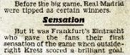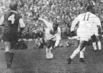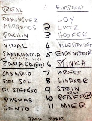 Vielleicht machte dieser überraschende Auftakt die Senores nervös. Denn vor ihrem wirklich ersten gefährlichen Vorstoß lagen noch zwei der Eintracht durch Stein und Kreß, die gestoppt werden konnten. Dann aber mogelte sich del Sol mit einem Steilpaß an der linken Seite entlang, an Stinka und Loy vorbei. Seine Flanke fand weder Freund noch Gegner auf der Höhe der Situation. Nach diesem ermutigenden Auftakt wagte sich sogar Eigenbrodt nach vorne und setzte Kreß mit einem feinen Zuspiel ein. Nach Lindners Vorlage zu Stein am rechten Flügel und der halbhohen Flanke auf den Fuß des zur Mitte gespurteten Kreß aber hatte in der 19. Minute kein Madrider mehr eine Chance (1:0).