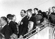 Ueberfüllt aber war der große Gesellschaftssaal im Zoo, der Endstation des Tages, an dem Treue und Anhänglichkeit bewiesen wurden. Maria Mucke sang: „Wir wollen niemals auseinandergehn...", Bully Buhlan: „...Berlin grüßt die Eintracht!", das Lumpaci-Quartett erzählte parodistisch die ganze Eintracht-Story vom Europapokal, Willy Schneiders Bariton ertönte, Otto Höpfner schlenzte die Pointen ins Feld wie Alfred Pfaff die Freistöße ins Tor, und zum guten Schluß die Mainzer Hofsänger: „So ein Tag..." Zwischen Tenor und Bass stand Richard Kress, großer Solist auf dem Spielfeld, großer Solist auch im Eintracht-Chor. Wer noch 24 Stunden vorher geknickt und niedergeschlagen gewesen sein sollte, jetzt war er fröhlicher und ausgelassener denn je zuvor. Die Hofsänger hatten „noch'n Pokal" mitgebracht. Pokal verloren, Freunde gewonnen! Herz, was begehrst du mehr? Und die Musik (Hans Schepior) spielte dazu, Sepp Herberger strahlte. Marika Kilius tanzte, der Tag, als die Eintracht kam, ging erst sehr, sehr spät zu Ende.