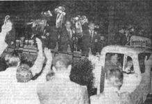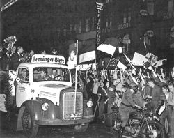 An der Villa Mumm stand die „Hundertschaft", die es gar nicht abwarten konnte, bis sie ihre Lieblinge begrüßen konnte. Und dann ging es hinein in immer dichtere Menschenmauern, die nicht gewankt hatten, obwohl es fast zwei Stunden dauerte, ehe der Zug mit Polizei, dem alten Auto, das den Vorstand vorwärtsschaukelte und den Bierwagen mit den Spielern, anrollte. Dort wurde gelacht, gejubelt, gesungen „...Eintracht Frankfurt wird Meister nächstes Jahr!". Ideen muß man eben haben. Leider wars schon dunkel geworden, die Spieler sahen nicht mehr viel vom Fahnenschmuck an den Kaufhäusern und Geschäften.