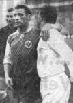 Die rein technischen Mittel Reals waren um soviel besser, daß die eigentlichen Spielmacher der Eintracht, gerade die, auf die es sonst ankommt, auch am Anfang, in der besten Eintrachtzeit, nicht in ihr Spiel kamen. Rein taktisch bot sich offenbar kein Ausgleich an. Wie die erste Halbzeit endete, ging es nachher weiter. Die „freie Wahl" in der Eintrachtabwehr schien manchmal zu bedeuten: Jeder nehme den ihm am nächsten Stehenden aufs Korn. Das erleichterte Real ein Aufbauspiel in dem die Eintracht nach der Pause nicht mehr viel zu bestellen hatte. Das heiße Thema: Elfmeter Also, eines scheint mir gewiß: Real war die klar bessere Mannschaft. Der Elfmeter hat die Frankfurter zwar noch einmal moralisiert, aber eine weniger entscheidende Wirkung gehabt als beispielsweise Reals dritter (völlig vermeidbarer) Treffer kurz vor Halbzeit. Deshalb sollte, wer auch in der Beurteilung kein „Foul" begehen will, den Elfmeter als nicht überwichtig ansehen. Immerhin, auch das verdient Erwähnung, den Elfmeter hätte der überhaupt in Regelfragen unsicher wirkende Schiedsrichter nicht pfeifen sollen. Er ging zwar zum Linienrichter, nicht um sich über die Art des Fouls mit ihm zu unterhalten, sondern weil er wissen wollte, oh sich der Zwischenfall noch im Strafraum abgespielt habe. Aber er entschied auf Strafstoß, obwohl Lutz seinen Gegner auf die faire und erlaubte Art des Schulterrempelns abdrängte. Fast alle Schiedsrichter würden hier ein Rempeln ohne Ball mit einem indirekten Freistoß geahndet haben. In Glasgow indessen wuchs sich der Vorgang zu einem Foul aus, und das war bei einem 3:1-Stand für Madrid eine erstaunliche Härte.