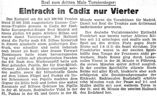 Eintrachts Kondition reichte nicht aus Eintracht Frankfurt — Stade Reims 1:4 (1:1) Die Frankfurter, die Schämer und Solz für Stein und Meier einsetzten, waren bis zur Pause durchaus ebenbürtig. Die beiden fügten sich ausgezeichnet in die Mannschaft ein. Vincent brachte . die Franzosen (27. Minute) in Führung, nachdem Elgenbrodt den Ball verfehlt hatte. Ein energischer Vorstoß von Kreß (34.) im Mittefeld bahnte den Ausgleich an. Schämer leitete den Ball zu Pfaff weiter, der trocken in die lange Ecke einknallte. Nach der Pause machten sich die Strapazen der Reise und des Turniers bei den Deutschen stärker bemerkbar als bei den Reimsern, die 6 Stunden mehr Ruhe gehabt hatten. Stein kam für Solz in den Angriff. Er stürmte In der Mitte, Schämer rückte nach linksaußen. Das Eintracht-Spiel verlor dadurch an Zusammenhang und Druck. In der letzten halben Stunde fielen die Frankfurter konditionell so stark ab, daß die Reimser noch zu einem klaren Sieg kamen. Die Tore: 1:2 Rustichelli (57.), 1:3 Vincent (66.), 1:4 Piantoni (88.). (aus dem 'Sport-Magazin')