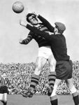 Genau um das Format dieses Stinka stand die FSV-Hintermannschaft der Hintermannschaft der Riederwälder nach. Grutschs Effekte beruhten in erster Linie auf einem soliden Knochenbau. Hammann flickte und stoppelte an den Verbindungen nach vorn herum wie ein fleißig Lieschen: aber das Konstruktive im eigentlichen Sinne ging auch ihm ab. So blieben die Bornheimer, die noch dazu das Pech hatten, auf einen Loy zu stoßen, der Eisenhofer nicht im mindesten nachstand, in dem Bemühen, die Eintracht spielerisch zu überflügeln, auf halbem Wege stecken. Andererseits trug dieses Bemühen dazu bei, daß die Janda-Elf eher dem VfB Stuttgart oder Bayern München ähnelte als einem Abstiegskandidat. L.D. Loy ahnte Buchenaus Richtung Vom Spielverlauf ist eingangs zu sagen, daß seine Höhepunkte vor der Pause und in der ersten Viertelstunde nach der Pause lagen. Dann flaute das Tempo ab, die Kräfte der Spieler ließen auf beiden Seiten nach, und der Eintracht war es nur noch darum zu tun, ihren Gegner nicht mehr zur Entfaltung kommen zu lassen. Die erste Ecke erzielte der FSV. Geiger spielte Buchenau an, dessen Schuß lenkte Loy neben das Tor (1.). Fast im Gegenzug wurde Eisenhofer geprüft. Zuerst wurde Weilbächers Schuß abgewehrt, dann zog Stein den Ball wieder vor das Tor und Eisenhofer konnte zur Ecke abwehren (4.). Das 0:1: Solz verfolgte den Ball, es sah schon aus, als sei dieser schneller, da konnte der Eintracht-Halblinke ihn kurz vor der Torauslinie einholen. Seine hereingezogene Flanke köpfte Stein an Eisenhofers Fäusten vorbei ins Tor (6.). Ein Fernschuß Hammanns springt Loy aus den Händen, er tupft das Leder auf — und das Publikum hinter seinem Tor will den Ball hinter der Linie gesehen haben (7). Schämer wird an der Seitenlinie verarztet (9.—11.), kommt mit bandagiertem Knöchel wieder ins Feld. Derweil jagte Geiger den Ball über die Latte (11.). Das 0:2: Kreß läuft durch, wird von Grutsch und Schäfer in die Zange genommen und von Schäfer zu Fall gebracht. Elfmeter! Stinka verwandelt ihn sicher (14.). Lindner wird hinter dem Tor verarztet (21.).