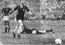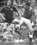 In der 46. Minute rollt eine schöne Kombination von Kreß über Stein zu Schämer, bei dessen Schuß Maklicza nachgreifen muß. Eine Flanke Kriegers nimmt Vollmar aus der Luft — vorbei (47.). Dann spielt Solz Keck den Ball durch die Beine zu Kreuz, der bedient Stein, der aus drei Metern über das Tor schießt! (49.). Ein Steilangriff Rohe— Meng—Vollmar zerstört Loy durch Fußabwehr (52.). In der 57. Minute spielt Thiel zum freistehenden Remark, der aus zehn Metern über das Tor schießt. Aber Saarbrücken kommt eine Minute später doch zum Ausgleich. Martin fädelt ein, Vollmar setzt sich gegen Lutz durch, und Loy ist geschlagen. Stinka stellt Maklicza auf die Probe (60), Kreß schießt, Maklicza lenkt ab, wehrt auch den Nachschuß Stinkas ab und pariert auch den anschließenden Kopfball Stinkas (65). Als Schymik zu Kreß spielt, landet dessen Schuß am Pfosten und Krieger rettet zur Ecke (70). Ein Kreuz-Schuß geht handbreit am Gästetor vorbei (74.). Die Saarbrücker wollen das Ergebnis halten, oftmals sind alle Spieler in der eigenen Hälfte. Wieder geht ein Kreuz-Schuß haarscharf vorbei (80 ), dann trifft Schämer die Latte (81). Es scheint beim 1:1 zu bleiben, da fällt doch noch ein Eintrachttor. Stein ist der glückliche Schütze. Die Frankfurter reißen die Arme hoch, die Saarbrücker lassen die Köpfe hängen. Plötzlich wandelt sich das Bild: die Gäste umhalsen sich. Das Tor hat keine Bedeutung mehr. Zimmermann hatte vier Zehntelsekunden vorher abgepfiffen. Horst Kickhefel (aus 'Der neue Sport' vom 23.05.1961) |