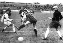 Das 1:0 war schon verdient. Der VfB-Sturm hatte nicht so zwingend gespielt, um eine Wendung zu bringen, und die Eintracht-Abwehr hatte wie gewohnt ihren Mann gestanden. Auch ein Sawitzki mußte zumindest noch einmal zu bezwingen sein, auch wenn Weilbächer mit seinen Vorlagen kein Glück gehabt hatte, auch wenn Kreuz nicht recht zur Geltung kam, auch wenn Lindner blaß geblieben war. Die Ereignisse schienen den Hoffnungen der Zuschauer recht zu geben. Die Eintracht spielte mit dem Wind, ein Schuß Schämers (auf Eigenbrodt-Flanke) flog knapp neben das Tor. Die Stuttgarter mußten umbauen, weil nach zehn Minuten ihr Stopper Neupert ohne Verschulden Schämers angeschlagen wurde. Aber der Wind drehte sich, und der Umbau festigte die Gästeabwehr! Ein Scharfschuß Geigers, der knapp über die Latte rutschte, deutete an, daß die Eintracht nicht aus dem Schneider war. Und dann reifte der Ausgleich. Eine Energieleistung Höllers! Er zog mit dem Ball nach innen, ließ sich von drei Frankfurtern nicht abdrängen und hatte dann die Kraft, noch aus 18 Metern mit einem Scharfschuß Loy zu schlagen! Und während im Eintrachtsturm immer weniger zusammenlief, blieb der VfB-Sturm bei seinem Stiebel: nicht locker lassen!