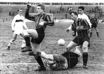 Sawitzkis tollkühne Taten Horst Kickhefel berichtet vom Riederwald Eintracht Frankfurt — VfB Stuttgart 1:2 (1:0) Ein Spiel von der eigenartigen Sorte. Zuerst schien die Eintracht den VfB in Grund und Boden zu spielen und die Zuschauer belächelten zu Beginn der zweiten Spielhälfte die dünnen „VfB"-Rufe der wenigen Stuttgarter Schlachtenbummler, die sich um zwei rotweiße Fähnchen scharten. Doch die elf Stuttgarter auf dem Rasen erwiesen sich von alter Schwabenart. Sie forchten sich nit und ließen sich selbst nicht von der renommierten Eintracht-Abwehr ins Bockshorn jagen. Vielleicht hatte Sawitzki seine Mitspieler moralisch aufgerüstet, denn Sawitzkis Heldentaten waren die Ursache, daß vor der Pause nicht aus dem 1:0 gar ein 4:0 oder 5:0 geworden war. Mit einer riskanten Rückgabe von Lutz fing das Spiel an, der Ball lief nicht so schnell, als Lutz erwartet hatte. Dafür lief Höller schneller, zog den Ball um Loy herum, aber niemand von seiner Mannschaft war mitgelaufen, so daß Loy den Ball wieder einholen konnte. Doch dann ging es vor Sawitzkis Tor los! Meier überlief Neupert, sein Schuß segelte am Tor vorbei und wurde von Lindner neben das Tor gedrückt. Mit dem 1:0 schien die Eintracht auf der richtigen Marschroute. Dieses 1:0 war ein Geschenk von Neupert. Neupert wollte Kreß von hinten vom Ball trennen und brachte ihn zu Fall. Da gab es nur Elfmeter, und für Torschütze Nr. 1 gab es nur das erwartete Tor. Sawitzki hatte keine Chance. Zehn Minuten später hätte Schiedsrichter Mors wieder auf Elfmeter entscheiden müssen. Diesmal auf der anderen Seite. Strohmaier wurde im Strafraum von drei Frankfurtern hart bedrängt, und als er schießen wollte, zog ihm Weilbächer das Schußbein weg. Mors verlegte den Tatort vor die Strafraumgrenze. Er war bis zur letzten Minute konsequent, er benachteiligte beide Mannschaften paritätisch! Bis zur Pause diktierte eine Mannschaft: die Eintracht. Neupert hatte mit Schämer (Stein fehlte wegen einer Prellung) seine Schwierigkeiten,, und der gleiche Neupert hatte vor vier Wochen einen Berti Kraus schachmatt gesetzt! Kreuz zeigte wieder einiges aus seiner Trickkiste, aber Hoffmann gab ihm nicht viel Bewegungsmöglichkeiten. Immerhin verteilte Kreuz wieder einige Vorlagen, die nur nicht zu Toren wurden, weil zwischen den Stuttgarter Pfosten ein Sawitzki stand.