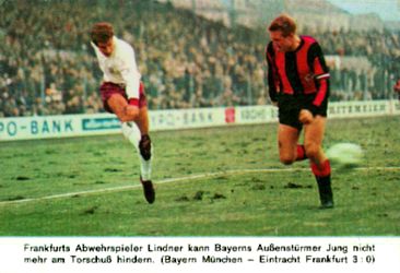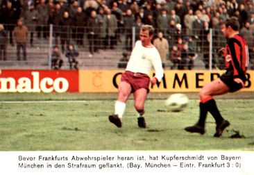 Die Hand des Peter Blusch Für beide Kontrahenten ist die heutige Partie der Start in eine Englische Woche. Während die Eintracht nächsten Dienstag ihr DFB-Pokalspiel in Köln gegen den 1. FC nachholt und am darauffolgenden Samstag die Dortmunder Borussen im heimischen Stadion am 26. Spieltag der Bundesliga empfängt, steht für die gastgebenden Bayern am Mittwoch das Viertelfinalrückspiel im Europapokal der Pokalsieger gegen den FC Valencia an (Hinspiel 1:1), ehe es am Samstag zur Bundesligapartie nach Mönchengladbach geht. Aus der personellen Not macht Trainer Schwartz bei der Aufstellung seiner Mannschaft eine Tugend und setzt beim FC Bayern München das Experimentieren mit jungem Gemüse fort. Nach Hölzenbein, der inzwischen regelmäßig bei den Profis zum Einsatz kommt, feiert mit Bernd Nickel der nächste hoffnungsvolle Kicker der Eintracht-Amateure seine Bundesligapremiere - und zwar bereits in der Startelf, in der Solz, für den Lotz auf den linken Flügel rückt, seinen Platz räumen muss. Mit nur 13.500 Zuschauern ist der Andrang im städtischen Stadion an der Grünwalder Straße eher überschaubar, als Schiedsrichter Hans Radermacher aus Siegburg die Partie um 15:30 Uhr anpfeift. Viel mehr Besucher, das wird dann schnell klar, hat dieses Spiel auch nicht verdient, denn es gestaltet sich nur selten unterhaltsam. Die Bayern sind zwar überlegen, doch das Spiel nimmt kaum Fahrt auf und Chancen bleiben Mangelware. Die Eintrachtabwehr steht gut gestaffelt, die Übergabe klappt reibungslos. So wird Gerd Müller von Blusch im Strafraum abgemeldet, zieht sich der Nationalmittelstürmer weiter zurück, drängt ihn Friedrich in eine unbedeutende Statistenrolle. Wenig kommt auch vom zweiten Innenstürmer Ohlhauser und den Außen der Gastgeber. Jusufi kann Brenninger an der Seitenlinie ein ums andere Mal ablaufen, Schämer hat es gegen Jung zwar schwerer, geht aber zumindest als knapper Punktsieger aus dem Duell hervor. In der 20. Minute kommt Beckenbauer nach Zusammenwirken mit Müller im Strafraum zu Fall, doch der Schiedsrichter hat kein strafstoßwürdiges Foul ausmachen können. Als die Frankfurter den ersten Ansturm der Bayern glücklich abgewehrt haben, kontern sie sehr energisch. So muss Maier weit häufiger eingreifen als Tilkowski. Doch die Eintracht-Schüsse, meist aus größerer Entfernung abgefeuert, bringen den Münchner Schlussmann nicht in Verlegenheit. Im Mittelfeld bewegen sich mit Koulmann und Huberts zwei Männer mit ähnlicher Spielanlage, die sich als Techniker und Regisseure und nicht als Kämpfer und Renner verstehen. Die Beiden gehen sich weitgehend aus dem Weg, spielen lieber quer als steil und schaffen es so trotz des eher betulichen Spieltempos nicht, merkliche Impulse zu setzen.