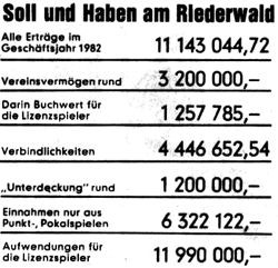 Zudem fehlen allein im Lizenzspielerbereich jährlich fast 2 Millionen Mark. 6.322.122 Mark Einnahmen aus dem Spielbetrieb stehen etwa acht Millionen Mark an Ausgaben gegenüber. Knispel will deswegen die Spielergehälter senken: „Bei zehn Prozent Gehaltskürzungen wären das über 600.000 Mark.“ „Ich wäre zufrieden, wenn unser neuer Etat (4.590.000 Mark Einnahmen sind geplant) in der Saison 83/84 ausgeglichen wäre“, sagt Knispel: „Die Aufgaben dürfen die Einnahmen nicht mehr übersteigen.“ „Wir senken den Profi-Kader von 22 auf 18 Lizenzspieler“, kündigt Vizepräsident Zenker flankierend an, will dabei aber angeblich auf keine Leistungsträger verzichten: „Wir sind uns mit Pezzey bei ersten Verhandlungen schon sehr nahe gekommen. Auch Körbel soll unbedingt bleiben.“