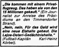 Viel Detari ... Während die sportlich Verantwortlichen bei der Eintracht überlegen, wie sie den Verkauf von Detari kompensieren können, gerät das Eintracht Präsidium bei Sponsoren, Fanszene und durchaus auch bei den Aktiven ins Kreuzfeuer der Kritik. Vor allem Schatzmeister Wolfgang Knispel steht dabei im Mittelpunkt. Seine Wohnung steht ebenso wie sein Büro in Mörfelden Walldorf seit Donnerstag unter Bewachung von Polizeikräften. Ihm wird vorgeworfen, durch den Verkauf von Stars wie Bruno Pezzey, Bum-Kun Cha, Thomas Kroth, Ralf Falkenmayer Thomas Berthold, Andreas Möller und nun Lajos Detari die stets leeren Clubkassen zwar jeweils zumindest kurzfristig wieder gefüllt zu haben, damit aber auch aktiv zu verhindern, dass die Eintracht in die obere Etage der Bundesliga aufsteigt. Wenig Verständnis für den Zorn der Anhänger bringt Präsident Klaus Gramlich auf: "Wer diesen Schritt nicht versteht, hat nicht richtig nachgedacht. Ich habe genauso viele Anrufe, die uns zu diesem sensationellen Transfer gratulieren. Ich bin fest davon überzeugt, dass wir richtig gehandelt haben. Ein unzufriedener Lajos Detari, der nachts nur noch von griechischen Millionen träumt, hätte uns nichts mehr gebracht." Detari soll in Piräus mehr als eine Million Mark netto verdienen.