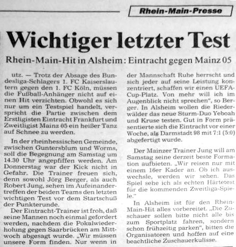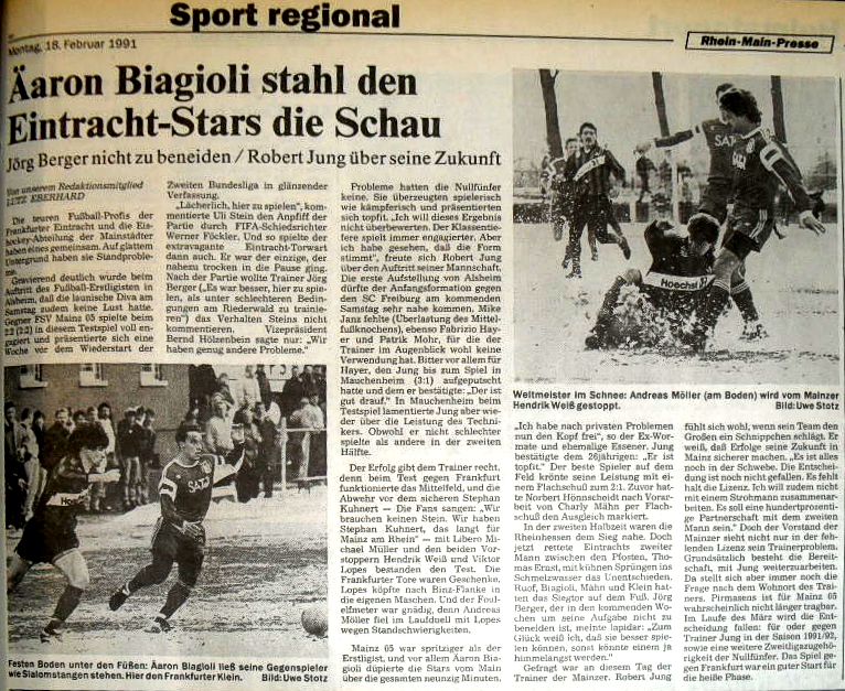 Schmeichelhaftes Remis für die Eintracht Fußball-Bundesligist Eintracht Frankfurt und Zweitligist FSV Mainz 05 trennten sich in einem kurzfristigen angesetzten Freundschaftsspiel bei schwierigen Platzverhältnissen in Alsheim bei Worms 2:2 (2:2). Eintracht-Trainer Berger, der mit seinem Mainzer Kollegen Jung die Partie vereinbart hatte, äußerte nachher ernüchtert: „Zum Glück weiß ich, daß meine Mannschaft besser spielen kann. Sonst könnte einem Angst und Bange werden." Der Frankfurter Torwart Stein konnte dagegen dem Einsatz am Samstag keinen Sinn abgewinnen und machte seinem Unmut lautstark Luft: „Es ist lächerlich, hier zu spielen." Von den vier Treffern, die vor 550 Zuschauern alle in der ersten Halbzeit fielen, gingen drei auf das Konto der Mainzer. Neuzugang Lopes sorgte mit einem Eigentor (5.) für die Eintracht-Führung, Hönnscheidt (10.) gelang der Ausgleich und Biagioli (17.), der beste Spieler auf dem Platz, brachte die Mainzer bald darauf in Führung. Ein umstrittener Foulelfmeter, den Falkenmayer (27.) verwandelte, verhalf den Frankfurtern zum schmeichelhaften 2:2. Die Mainzer verzeichneten noch einen Pfostenschuss, ein Abseitstor und zwei Schüsse knapp neben das Tor, denen Stein jeweils nur reaktionslos nachsah. ('Frankfurter Rundschau' vom 18.02.1991)