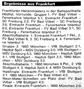 Eintracht gewinnt Zuhause Zum sechsten Male hat die Frankfurter Eintracht das heimische Hallenturnier gewonnen und mit den 150 Siegpunkten das Masters Turnier am 27./28. Januar in Dortmund mit Sicherheit erreicht. Zudem strich die Mannschaft 25.000 Mark an Preisgeld ein. Endspielgegner 1860 München bekam 15.000 Mark und 100 Punkte. Becker und Bindewald sorgten für den 2:0-Erfolg. Die Eintracht vermochte sich wie in Essen (Dritter) und Leipzig (Sieger)zu steigern. „Das war schon eindrucksvoll von meinen Jungs“, sagte Trainer Körbel. Die Eintracht stellte auch den besten Torschützen, der 22 Jahre alte Amateur Frank Grimm traf fünfmal. Zum besten Spieler wurde der Stuttgarter Balakow, zum besten Torhüter Holger Zimmer vom FV Bad Vilbel gewählt. Der FV sicherte sich durch ein 4:3 im Neunmeterschießen gegen Stuttgart Platz drei. 11.000 Zuschauer verfolgten das Turnier an beiden Tagen. Am Sonntag vermißte man die zuvor lautstarken türkischen Fans. Die klatschten auch eifrig mit, als erste gelungene Szene in der ersten Minute des ersten Gruppenspiels am Samstag viel versprach. Das konnte im weiteren Turnierverlauf nicht gehalten werden. Der Bulgare Balakow und der Brasilianer Elber scherbelten den Ball so gekonnt durch die Reihen der Münchener Löwen, daß Elber ihn nur ins leere Tor zu schieben brauchte. Vielleicht verführte der Auftakt den VfB zum Irrglauben, alle Gegner schwindelig spielen zu können. Die Münchener aber hatten gleich nach dem frühen Schock den Stuttgartern Grenzen aufgezeigt und sicherten sich die Halbfinalteilnahme schon am Samstag. Da stand auch fest, daß der MSV Duisburg die Koffer packen konnte. Daß der VfB und nicht Split ins Halbfinale einzog, war weniger das Verdienst des VfB als das von Torwart Ziegler, der in der Schlußminute das 2:2 festhielt. Es bescherte dem VfB bei Punktgleichheit das bessere Torverhältnis. In der anderen Gruppe brach das große Staunen aus über den FV Bad Vilbel, der viel aus seiner Außenseiterrolle machte. Ihm kam zupaß, daß er am Anfang auf die Spieler von Fehnerbace Istanbul traf, die mit Ausnahme des früheren Frankfurters Erol Bulut dem wirren Treiben in kleiner Halle hilflos ausgeliefert waren. So verloren sie vor 500 türkischen Fans auch gegen die Eintracht 6:0. Bad Vilbel schockte auch den SC Freiburg, bei dem Torwart Schmadtke zu den Feldspielern und beim 2:2 gegen die Eintracht auch zu den Torschützen zählte, mit dem „18-Sekunden-Tor" von Enis Dzihic. Dzihic traf noch zum 2:0. Die Eintracht hatte die Formation aufgeboten, die in Essen Platz drei erkämpfte, ergänzt um Dickhaut, Bunzenthal und Neuzugang Ned Zelic, der allerdings wegen einer Fußverletzung nur in einer Partie mitwirkte. Von der Formation, die in Leipzig Turniersieger geworden war, fehlten Flick, Ekström und Hennig. Beim 2:2 gegen Freiburg hatte die Eintracht Glück, daß Hagner mit fulminantem Drehschuß kurz vor Schluß der Ausgleich gelang. Gegen Istanbul war es dagegen leicht zu glänzen. Die Eintracht stoppte dann auch die Underdogs aus Bad Vilbel (3:1). Im Halbfinale war die Freude groß, als Ivica Mornar, den die Fans mit Sprechchören feierten, wenn er nur den spärlich behaarten Schädel über die Bande streckte, mit der ersten Ballberührung das Führungstor gegen den VfB Stuttgart schoß. 4:1 hieß es am Ende. Im anderen Halbfinale gewann München mühsam gegen die müden Bad Vilbeler mit 4:2. (FR)