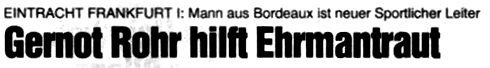 tätig "Wer die Sonne in Südfrankreich gegen den deutschen Regen eintauscht, dem muss die Sache viel bedeuten und der muss gute Perspektiven sehen. Ich betrachte meine neue Aufgabe bei Eintracht Frankfurt als große Herausforderung und bin sehr motiviert. Ich habe hier Menschen gefunden, die zu meiner Mentalität passen. Menschen, die arbeiten und sich nicht für die Größten halten", erklärt Gernot Rohr auf der eilig anberaumten Pressekonferenz. Überall herrscht Begeisterung über den Glücksgriff der Eintracht, der auch beim DFB als Jugendkoordinator im Gespräch war. Beim Verband zeigt man sich als guter “Verlierer“, wie DFB-Sprecher Nowak betont: "Wichtig ist nur, dass wir im deutschen Fußball viele so kompetente Menschen wie Rohr haben. Davon profitieren alle." Dies meinen auch die regionalen Medien in ihren ersten Reaktionen, so wie Klaus Veit von der FNP am 2. Oktober: “Zunächst der eminent wichtige Sieg über Nürnberg, dann die Chance für Ralf Weber, bald wieder das Nationaltrikot überzustreifen. Und nun, als vorläufige Krönung, die Verpflichtung von Gernot Rohr als Technischer Direktor (...). Gernot Rohr ist nicht nur ein Glücksgriff für die Eintracht, sondern auch für Rolf Heller. Dem Präsidenten, 1996 selbst als Glücksfall zum Verein gekommen, drohte zuletzt die Gefahr, im Haifischbecken der obersten deutschen Spielklasse zerfleischt zu werden.“ Soviel sei gewiss, die Meinungen werden sich ändern … (tr)