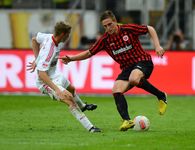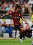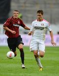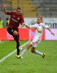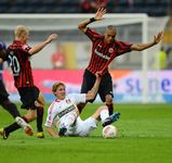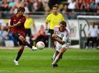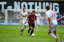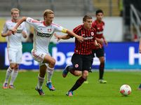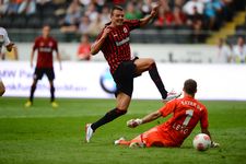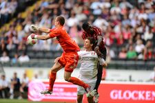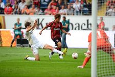 Denn wie versprochen, bietet die Eintracht den Gästen von Beginn an Paroli, um bei Ballbesitz über die Außen den Weg nach vorne zu suchen. Noch gibt es allerdings kein Durchkommen und da es im Mittelfeld sehr eng ist, versucht es Leverkusen vorwiegend mit langen Pässen, gefährlich vor den Kasten von Trapp zu kommen. So wie in der 6. Minute, als Reinartz den Ball in den Lauf von Kießling lupft, der sich gegen Oczipka und Anderson durchsetzt, mit seinem Schuss aus 16 Metern aber an Trapp scheitert. Die Gäste übernehmen jetzt zunächst das Kommando und die Eintracht hat ein paar Probleme, sich auf die Pässe in Richtung der schnellen Spitzen Kießling und Schürrle einzustellen. Aber noch hält die Abwehr und als Rode einen schönen Pass auf den startenden Jung spielt, kommen auch die Hausherren zu ihrer ersten Möglichkeit. Jung flankt gefühlvoll in die Mitte, wo Inui vom Elfmeterpunkt aus abzieht, sein Schuss aber zum Glück für Torhüter Leno geblockt werden kann (13.). Vier Minuten später wird es erneut gefährlich für den Leverkusener Torhüter, als er einen Lupfer von Schwegler vor dem hochsteigenden Occéan nur nach vorne patscht, so dass Meier plötzlich den Ball vor seinen Füßen hat, aber zu überrascht ist und ihn aus vierzehn Metern über den Kasten schnickt. Aber sie merken, wie es gegen die Gäste geht und setzen Leverkusen mit direktem Spiel über die Außen unter Druck. Nachdem Meier mit einem Kopfball nur um Zentimeter scheitert, wird es drei Minuten später über die linke Seite schnell, als Rode auf Oczipka spielt, um zu einem Spurt anzusetzen. Tatsächlich bekommt er den Pass an der Torauslinie und spielt zurück auf Aigner, der die Kugel volley in die Maschen zimmert. Doch ausgerechnet der Linienrichter auf der anderen Seite will gesehen habe, dass der Ball beim Pass von Rode bereits die Torauslinie überquert hat und hebt sein Fähnlein. Welch ein Luchsauge, denn nicht einmal die TV-Bilder können dies eindeutig belegen (23.). Weiter spielen beide Mannschaften mit offenem Visier, Anderson lässt sich an der Mittellinie auf ein unnötiges Duell mit Bellarabi ein und verliert prompt den Ball. Der 22-Jährige stürmt nach vorne und schickt Kießling in den Strafraum, doch wieder ist Trapp zur Stelle und kann den Schuss mit einer tollen Fußabwehr parieren (26.). Kurz darauf verliert Aigner das Leder am Mittelkreis und plötzlich wird es schnell. Schürrle startet und passt nach rechts zu Bellarabi, der mit einem Haken Anderson versetzt und aus elf Metern abzieht. Trapp ist zur Stelle, kann den Ball aber nur noch nach vorne prallen lassen, wo Kießling zur Stelle ist und ihn aus kurzer Distanz zum 1:0 in die Maschen schiebt (29.). “Das ist der größte Unterschied zur zweiten Liga, so ein Fehler wird eiskalt bestraft. Da muss ich noch lernen“, ärgert sich Aigner über seinen folgenschweren Fehler. Jetzt wird es hektisch, die Emotionen schlagen hoch, während die Eintracht auf den Ausgleich drängt. Wieder ein Foul, zunächst reißt Kießling am Mittelkreis Zambrano um und dann behacken sich Bellarabi und Anderson. Blöd von Anderson, dass er sich zu einem kleinen Gerangel und einer angedeuteten Kopfnuss hinreißen lässt, um dafür Gelb zu kassieren. Danach scheitert erst Kießling mit einem Kopfball am glänzend reagierenden Trapp und nur Sekunden später ergeht es Meier nicht besser, nachdem er zuvor glänzend von Occéan frei gespielt wurde (37.).