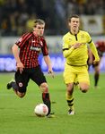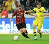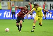 Schranken zu weisen: "Wenn man uns vergleichen will, “Es ist blöd, dass die Dortmunder in Hamburg verloren haben“, meint Bruno Hübner und in der Tat, bei der Borussia ballt nicht nur Trainer Klopp die Fäuste, sondern auch die Mannschaft will es wissen, nachdem die Serie von 31 Spielen ohne Niederlage an der Alster gerissen ist: “Wir haben das Gefühl, etwas gutmachen zu wollen - und zwar unbedingt.“ Wie bereits in den Spielen zuvor ändert der Trainer für dieses Unterfangen seine Startaufstellung. Blaszczykowski beginnt anstelle von Götze im rechten offensiven Mittelfeld, Perisic rückt auf links, um Schmelzer gegen die Frankfurter Außen zu unterstützen und Reus agiert im zentralen Mittelfeld hinter Lewandowski, der es wohl mit Zambrano zu tun bekommt. Ausverkauftes Waldstadion, es herrscht bereits kurz vor Spielbeginn eine tolle Stimmung, während die Nordwestkurve unter einer riesigen schwarz-weißen Blockfahne verschwindet und die Frankfurter vom Anpfiff weg überfallartig nach vorne sprinten, als wollen sie ein Zeichen setzen. Hoffer dribbelt die Abwehr ein wenig schwindelig, um sich dann festzulaufen und Inui gibt nach einer Kopfballvorlage von Meier sogleich einen ersten Warnschuss ab (2.). Sie bleiben bissig und aggressiv, so dass es gut 8 Minuten dauert, bis Piszczek für ein wenig Entlastung sorgen kann, als er sich auf der linken Seite gegen Inui und Oczipka durchsetzt und quer auf Leitner passt. Der zieht aus halblinker Position wuchtig ab, doch Trapp bekommt die Fäuste hoch und lenkt den Ball ins Toraus. Dies beeindruckt die Gastgeber wenig, nur eine Minute später sprintet Inui nach Pass von Meier nach vorne, versetzt Schmelzer und Piszczek, verfehlt aber das Tor bei seinem Schuss von der Strafraumgrenze knapp. Das Spiel behält sein hohes Tempo, die Eintracht attackiert aggressiv, leistet sich aber zu viele unnötige Fehler im Aufbauspiel, um ernsthaft gefährlich zu werden. Die Gäste spielen da abgeklärter und drücken die Frankfurter jetzt peu à peu stärker in die Defensive, so dass diese nur noch reagieren und kaum noch agieren können. Gut nur, dass beim BVB die Genauigkeit beim entscheidenden Pass fehlt, so dass Chancen Mangelware bleiben. Bis zur 25. Minute, als Hummels von der Mittellinie einen schönen Diagonalball auf die rechte Seite spielt, wo Piszczek den Turbo zündet, Oczipka schwindelig spielt und nach innen zieht, um aus zwölf Metern abzuziehen. Was für ein Pech, Anderson, der den klärenden Oczipka zu Hilfe eilen will, springt der Ball gegen den Oberkörper, so dass der an Trapp vorbei zum 0:1 ins Netz trudelt. Nun wirken sie irritiert und Schwegler meint, “wir hatten zu viel Respekt.“ So sieht es aus und der deutsche Meister nutzt diese Schwächephase. Vier Minuten später kann Kehl den Ball aus der eigenen Hälfte zwischen Meier und Rode hindurch zu Blaszczykowski spielen, der wiederum die Lücke zwischen Inui und Oczipka nutzt, um zu Piszczek zu passen. Der setzt sich auf rechts durch, um die Kugel hart und flach zurück vor den Strafraum zu spielen. Lewandowski lässt passieren, nicht aber Reus, der mutterseelenallein an den Ball kommt und ihn aus 20 Metern an den linken Innenpfosten zimmert, von wo aus er zur 2:0-Führung für Dortmund ins Netz springt (28.). “Da habe ich nur noch an Schadensbegrenzung gedacht“, stöhnt Heribert Bruchhagen, während die Frankfurter an diesen Doppelschlag zu kauen haben, auch wenn ein Freistoß von Meier nur zwei Minuten später knapp neben dem linken Pfosten landet. Doch sie können keinen Druck aufbauen, immerhin versucht es Meier nach schönem Querpass von Rode mit einem Direktschuss, der aber weit über die Latte segelt (37), Inui scheitert mit einem Dribbling und Jung mit einem Volleyschuss, während auf der anderen Seite Blaszczykowski sich mit einem Distanzschuss versucht, den Trapp aber sicher pariert (39.). Gefährlicher wird es da bei einer scharfen Flanke von Oczipka, die Weidenfelder unterläuft, aber Subotic klärt für seinen in dieser Szene unsicheren Keeper (43.). Glück hat auch der tüchtige Trapp Sekunden vor der Pause, als Perisic einen Eckball von Reus gut verlängert, Lewandowski am langen Pfosten aber einen Schritt zu spät kommt.