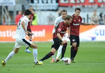 Statt Glanz und Gloria ein Sieg des Willens "Jetzt sage ich Ihnen ganz klar, dass es nichts anderes gibt als unser Ziel. Warum soll ich für die Mannschaft etwas anderes ausgeben als den Klassenerhalt“, antwortet Armin Veh genervt auf das ständige Nachhaken der Medien und die Lobeshymnen über sein Team. Persönlich, meint er, gibt es für ihn allerdings eine Konsequenz: “Ich lasse mich jetzt von meiner Frau siezen.“ Sogleich legt er ernsthaft nach: "Ich sehe jetzt nicht, dass wir der Favorit sind. Wir sind der Aufsteiger, das darf man nicht vergessen. Der Sportclub ist eine freche Mannschaft, die früh stört und versuchen wird, ihr Spiel durchzubringen. Ich glaube nicht, dass die besonders beeindruckt sind von unserer Erfolgsserie.“ Die es nach Möglichkeit gegen den Tabellenzwölften auszubauen gilt und zwar mit Hoffer im Sturm, da Occéan noch an seiner Zerrung laboriert. Somit beginnt die gleiche Mannschaft wie beim Wahnsinn gegen Dortmund. Der Klassenerhalt ist auch das erklärte Ziel der Breisgauer, doch nach zuletzt nur einem Punkt aus der englischen Woche ist SC-Trainer Streich, der einst mit dem FC Homburg in der Bundesliga spielte, unzufrieden: "Wir müssen es dem Gegner schwerer machen, Tore zu erzielen. Wir müssen anscheinend noch mehr tun." Das dies gegen die Eintracht schwer wird, ist ihm dabei klar: "Das ist eine Mannschaft mit Zug zum Tor, die sich durch ihr Spiel selber euphorisiert. Mir gefallen sie auch, es macht Spaß, den Frankfurtern zuzuschauen. Da müssen wir uns natürlich viele Gedanken machen. Aber wir werden alles tun, um wieder ein gutes Spiel zu machen und uns nicht von unserem Weg abbringen lassen.“ Die personelle Antwort auf seine Gedanken ist, dass Freis im Angriff anstelle von Guedé beginnen wird und dass die beiden Außenverteidiger heute ihre Seiten tauschen, so dass Sorg rechts verteidigt und Mujdza links. Diesmal ist es kein Hurra-Beginn der Eintracht, von Beginn an attackiert Freiburg sehr früh und macht mit seiner vorgeschobenen Abwehrkette die Räume bereits an der Mittellinie sehr eng. Rode, Schwegler und Inui werden von Beginn an fast in Manndeckung genommen, aber auch auf rechts gibt es für Aigner und Jung kein Durchkommen, so dass sich das Frankfurter Aufbauspiel zwangsläufig immer mehr in die Mitte verlagert. Da den Breisgauern bei Ballbesitz aber ebenfalls wenig einfällt, gibt es erst in der neunten Minute die erste Chance nach einem Freistoß vor dem linken Strafraumeck. Caligiuri schlenzt nicht wie erwartet in den Strafraum, sondern schickt Kruse einfach steil, der Jung aussteigen lässt und zurück auf Schuster passt, dessen Schuss Oczipka für seinen Torhüter klären kann (9.). Und die Eintracht? Inui kann sich endlich einmal freilaufen, wird jedoch prompt von Makiadi von den Beinen geholt. Schwegler zieht den Freistoß aus spitzem Winkel direkt auf den Kasten, doch Torhüter Baumann kann parieren (16.).