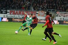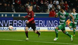 Pünktlich zu Beginn der zweiten Halbzeit öffnet der Himmel noch einmal seine Schleusen, während die Gäste weit bissiger beginnen, als im ersten Abschnitt. So gerät die Eintracht auf dem rutschigen Geläuf immer mehr ins Schwimmen. So muss Oczipka Nehring nach einem Ballverlust weggrätschen, um den drohenden Konter zu unterbinden. Prib zieht den Freistoß von der rechten Außenbahn mit viel Effet aufs lange Eck, aber erneut ist Trapp zur Stelle (49.). Doch seine Ruhe und Souveränität steckt seine Mitspieler nicht an, wie es Occéan bei einem Konter eindrucksvoll demonstriert. Wie von der Tarantel gestochen sucht er den Weg in den Strafraum, läuft sich allerdings an drei Fürthern fest, statt einen Mitspieler zu suchen. Noch schlimmer ist, dass die Gäste jetzt zeigen, wie Kontern geht. Sofort wird der Ball an den Mittelkreis gespielt, wo Rode ins Leere grätscht und Sararer Demidov narrt, um das Leder durch die Gasse der aufgerückten Restabwehr genau auf Stieber zu legen. Von der Strafraumgrenze aus überwindet der 24-jährige Ungar den ihm entgegen kommenden Trapp mit einem gefühlvollen Heber, der zum Ausgleich im Netz landet (53.). Kurz darauf reagiert Armin Veh das erste Mal und bringt Matmour für den völlig indisponierten Inui. Aber es wird nicht besser, im Gegenteil. Auch Anderson unterläuft ein schwerer Fehler, als er sich nach einem weiten Abschlag von Grün heftig verschätzt. Statt zu klären, lässt er sich vom hochspringenden Ball übertölpeln, so dass Asamoah freie Bahn hat. Aus 15 Metern schießt der 34-Jährige, findet allerdings erneut seinen Meister in Trapp, der das Leder mit einer Faust über die Latte lenken kann (58.). “Ich habe versucht, einen Lupfer zu machen. Aber heute war ich vorne vollblind. Wenn du als Stürmer solche Geschenke bekommst, dann musst du eines annehmen“, ärgert sich Asamoah, während der Trainer kurze Worte des Lobs findet: "Unser Torwart ist einfach gut.“
