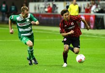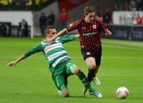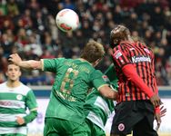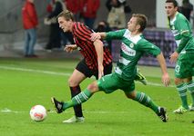 Und schmerzlich beim Zweitligameister vermisst wird, denn Nachfolger Asamoah hat bislang noch nicht getroffen. Aber in Fürth setzen sie weiter auf ihn und die mannschaftliche Geschlossenheit. “Wir müssen immer einen großen Aufwand betreiben. Der Klassenerhalt wird ein Kampf bis zum letzten Spieltag, den wir annehmen“, erklärt Trainer Mike Büskens und Manager Hack ergänzt: “Wenn wir über Frankfurt reden, ist ganz klar, dass das eine Bundesliga-Mannschaft ist, während die erste Liga für uns komplettes Neuland darstellt. Bei der Eintracht ist der Abstieg ein Betriebsunfall gewesen, sie haben sieben oder acht Millionen Euro investiert, um die besten Spieler aus der zweiten Liga zu kaufen. Für uns ist das nicht machbar.“ Machbar sein sollen dafür die nächsten Auswärtspunkte, für die der Trainer seine Elf auf ein defensiveres System umstellt, in dem Asamoah als einzige Spitze agiert und Edu für Petkovic als zweitem Abräumer vor der Abwehr auf die Bank weichen muss. Kaum haben die Sitzschalenbesucher bei heftigem Schmuddelwetter Platz genommen, da springen sie auch schon wieder begeistert auf. Denn unmittelbar nach dem Anstoß schlenzt Anderson einen langen Ball nach vorne, den Meier mit dem Kopf auf Rode weiterleitet, der sofort von der rechten Seite in den Strafraum sprintet und aus spitzem Winkel abzieht. Torhüter Grün klärt vor Occéan, aber das Leder springt zurück in die Mitte, wo Fürstner wegrutscht, während Meier Standfestigkeit beweist. Gegen drei Fürther setzt er sich mit zwei schnellen Schritten durch und schießt die Kugel nach einer schnellen Drehung aus 13 Metern ins linke Toreck zur 1:0-Führung für die Eintracht nach 24 Sekunden. Was für ein Auftakt, der Sicherheit zu geben scheint, während Fürth zwar engagiert dagegen hält, es aber an der nötigen Präzision im Spiel nach vorne missen lässt. Bei den Frankfurtern läuft es hingegen über die linke Seite mit Meier und Oczipka, der von Pekovic allerdings von den Beinen geholt wird. Schwegler flankt den fälligen Freistoß in die Mitte, aber Fürstner kann vor Occéan klären (7.). Langsam schleichen sich jedoch kleine Unsicherheiten in das Spiel der Gastgeber ein. Die Konzentration und der letzte Biss gehen ob der vielleicht zu frühen Führung und der konsequent harten Gangart der Gäste immer mehr verloren, auch wenn es nach einem Doppelpass zwischen Rode und Meier, der Inui den Ball in den Lauf spielt, noch einmal schnell wird. Inui läuft in den Strafraum und will ins rechte Toreck schlenzen, doch Grün kann den zu ungenauen Schuss parieren (12.). "Ich kenne meine Jungs, sah nach einer Viertelstunde, dass heute die Frische etwas fehlt", meint Armin Veh und Recht hat er leider. Denn vorbei ist es mit der Herrlichkeit, tumb wird der Ball quer gespielt oder einfach weit nach vorne geschlagen. Schwegler, der meist in Manndeckung genommen wird, kann die Aktionen kaum strukturieren, während sich die Abspielfehler häufen und die rechte Seite mit Aigner und Jung so gar nicht in das Offensivspiel eingebunden ist. Greuther Fürth findet hingegen besser ins Spiel und kommt zur nächsten Ecke, die geklärt werden kann. Schmidtgal kommt im Halbfeld an den Ball und schlenzt ihn auf links in den Lauf von Sararer, der abzieht, aber Trapp ist zur Stelle (22.). Passend zum Wetter wird es jetzt vollends fahrig, Jung spielt einen schlampigen Rückpass zu seinem Torhüter, Asamoah startet, aber Trapp ist schnell draußen und kann den Ball rechtzeitig wegschlagen (24.). Kurz darauf macht es Inui seinem Kollegen mit einem viel zu kurzen Rückpass auf Rode erfolgreich nach. Diesmal kommt Asamoah an das Leder und stürmt mutterseelenallein in den Strafraum. Doch vor dem Frankfurter Keeper verzettelt er sich zum Glück (27.).