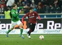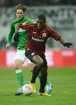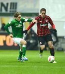 "Er kam als "Ich glaube, wir kriegen langsam Konstanz ’rein." Ein schöner Satz, den Bremens Innenverteidiger Prödl nach dem 4:1-Sieg in Hoffenheim am letzten Spieltag los lies. Denn genau daran hapert es bei den Nordlichtern in dieser Saison. Nach einem Sieg folgte meist sogleich eine Niederlage, zwei Siege in Folge gab es zuletzt vor über einem Jahr. Doch dies interessiert Werders Urgestein Thomas Schaaf wenig, der die fehlende Konstanz nicht bei den Leistungen sondern bei den Resultaten ausmacht und Parallelen zur Eintracht zieht: “Man muss festhalten, dass Frankfurt eine Klasse-Saison spielt. Sie haben viele begeistert, sind sehr frisch aufgetreten, haben dabei offensiv viel bewegt und sehr gute Ergebnisse abgeliefert. Das sind positive Dinge, die man auch auf uns übertragen kann.“ So setzt er auch im Waldstadion auf seine Sturmreihe mit Elia, Petersen sowie Arnautovic und vor der Abwehr wieder auf den zuletzt gelbgesperrten Junuzovic. Bitterkalt ist es im ausverkauften Waldstadion, dazu das fast schon gewohnte Schweigen von den Rängen in den ersten zwölf Minuten und zwölf Sekunden, um gegen das DFL-Papier “Sicheres Stadionerlebnis“ zu protestieren. Auch auf dem Platz ist nicht allzu viel zu sehen, da die Gäste dem Spieltrieb der Hausherren mit einer überraschend eng und tief stehenden Defensive begegnen und auf Konter lauern. So ist außer einem Schüsschen von Peterson (6.) und einem Stoß von Selassie gegen den in den Strafraum sprintenden Rode (8.) zunächst nicht viel zu sehen. Erstmals gefährlich wird es nach 12 Minuten, als Meier nach schönem 40-Meter-Pass von Schwegler die Kugel vor dem linken Strafraumeck in Bedrängnis gekonnt annimmt und aus der Drehung abzieht, sie aber über das rechte Toreck hämmert. Langsam nimmt das Spiel an Fahrt auf, die Eintracht zeigt sich lauffreudig und auch auf den Flügeln sorgen Aigner sowie Inui mit ihren Sprints in den Rücken der Werderabwehr immer wieder für Unruhe. Doch der letzte Pass fehlt, die Zielgenauigkeit und die zündende Idee, so dass sie kaum Gefahr ausstrahlen, während die Gäste sich weiterhin nur mit schnellen Gegenstößen zeigen, die ebenfalls versanden. Einzig eine Ecke von der rechten Seite sorgt für ein Raunen, als sich Selassi davon stiehlt und zum Kopfstoß ansetzt, der allerdings weit über die Latte segelt (28.). Kurz darauf wird es aus dem Nichts plötzlich brandgefährlich, als ein Befreiungsschlag der Bremer bei Junuzovic landet, der reaktionsschnell auf links nach vorne sprintet, während Petersen und Arnautovic Richtung Strafraum streben. Gut, dass Butscher nicht hektisch wird, sondern seelenruhig den Pass von Junuzovic abwartet, um diesen zu blocken (30.).