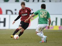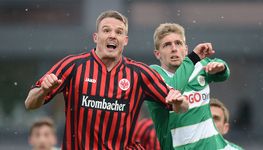 wissen, dass es eine harte Nuss wird.“ Dafür setzt Noch immer ist vom Frühling in Deutschland nichts zu sehen und so führt die Eintracht den Anstoß bei leichtem Schneefall auf tiefem und holprigem Geläuf aus. Hektisch ist es, Fürth startet einen ersten Angriff über die linke Seite mit Baba, dessen Flanke zur Ecke geklärt wird. Nehring schlenzt das Leder in die Mitte, wo Meier am linken Fünfereck hochsteigt und klären will. Aber wie… Er trifft die Kugel mit dem Hinterkopf, die in hohem Bogen in Richtung des langen Pfosten fliegt, wo Oczipka weder am Pfosten noch nah genug bei Djurdjic steht, um den 25-jährigen Serben am Einköpfen zu hindern (2.). "Das geht ja super los. Aber ich muss da hin und kann nicht einfach den Kopf wegziehen", erklärt Meier, während der Trainer mit den Schultern zuckt: “Das ist blöd gelaufen“ und sich über Oczipka ärgert: “Der war in der ersten halben Stunde überall, nur nicht auf dem Platz.“ Wie einige andere auch, denn, sie wirken konsterniert. “Zehn Minuten brauchten wir, um uns davon zu erholen“, meint Sebastian Jung. Hektisch agieren sie, immer wieder bringen ungenaue Zuspiele die Gastgerber in Ballbesitz, die damit aber wenig anfangen können. So kommt Nehring nach einem missratenen Abschlag von Nikolov zwar an den Ball und kämpft sich bis zur Torauslinie durch, doch sein Rückpass kann Zambrano klären (6.). Nach knapp neun Minuten zeigt sich endlich einmal die Eintracht über Inui und Aigner, dessen Flanke zur Ecke geklärt wird, die Oczipka von rechts ausführt. Meier verlängert den Ball am Fünfer Richtung langer Pfosten, wo Lakic hochsteigt und der dahinter stehende Aigner einköpft. Doch die Fahne ist oben, Aigner stand einige Zentimeter im Abseits. Dann die zwölfte Minute, nachdem Sararer Nikolov aus spitzem Winkel mit einem Schuss prüft, wirft der Torhüter die Kugel zu Jung, der auf der rechten Seite im Zusammenspiel mit Lakic nach vorne sprintet und sie quer zu Meier legt, der direkt quer zu Inui passt. Vor dem Sechszehner stoppt der Japaner den Ball, versetzt Zimmermann mit einem Hacken und schießt das Leder ebenso flach wie präzise zum 1:1 ins linke Toreck. Ein klasse Tor, das ein wenig Sicherheit bringt. Nun übernehmen die Frankfurter die Initiative, doch noch immer ist die Fehlpassquote viel zu hoch. Rode gelingt trotz allem Einsatz kaum ein Zuspiel und auch Oczipka auf der linken Seite steht weiter neben sich. Er ist aber leider in guter Gesellschaft, denn auch Meier und Schwegler gelingt bislang kaum ein sauberer Pass. Mehr als Stückwerk zeigen sie hingegen in der 23.