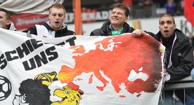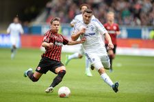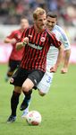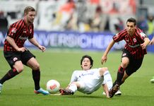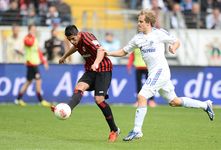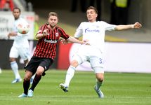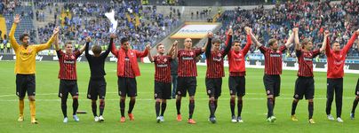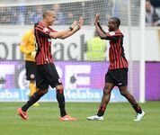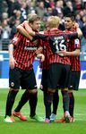 Bericht und Fotos von www.eintracht.de: Die Eintracht meldet sich zurück In der mit 51.500 Zuschauern ausverkauften Commerzbank-Arena besiegte die Frankfurter Eintracht den FC Schalke 04 am 30. Spieltag der Saison 2012/2013 mit 1:0. Das Tor des Tages erzielte Russ (40.). Nikolov hielt einen von Bastos getretenen Handelfmeter (24.). Erzielte per Kopf das 1:0: Marco Russ. Bamba Anderson und Carlos Zambrano jubeln mit. Erzielte per Kopf das 1:0: Marco Russ. Bamba Anderson und Carlos Zambrano jubeln mit. Im Vergleich zum Auswärtsspiel gegen Augsburg nahm Eintracht-Coach Armin Veh vier Änderungen in der Startaufstellung vor. Für die verletzten Schwegler und Meier rückten Russ und Stendera ins Team. Celozzi durfte für den gelbgesperrten Jung von Beginn an ran. Zudem lief Matmour im Sturm für Lakic auf. Die ersten Minuten der Partie waren recht zerfahren. Trotz des Bemühens beider Teams um kontrollierten Spielaufbau blieben die Angriffsversuche meist in den gegnerischen Abwehrreihen hängen. Schalke war zunächst das etwas aktivere Team und hatte auch die ersten, nennenswerten Torgelegenheiten. Innerhalb von nur zwei Minuten tauchten die Gäste gleich dreimal gefährlich vor dem Tor von Nikolov auf. Bastos passte in der 10. Minute geschickt in den Strafraum, wo Höger nur knapp verpasste. Anschließend klärte der Frankfurter Torhüter Nikolov einen Torschuss von Bastos per Fußabwehr. Bastos war mit einem langen Pass bedient worden und hatte im Strafraum aus halbrechter Position abgezogen (11.). Wiederum nur kurz später scheiterte Draxler mit einem Schuss (11.). Das Spiel nimmt Fahrt auf Zwei Minuten später war die SGE das erste Mal einem Tor nahe. Inui kam über links, doch der Pass des Japaners in den Fünfmeterraum rauschte an Freund und Feind vorbei (13.). Anschließend war die Eintracht zweimal mit Freistößen aus dem rechten Halbfeld gefährlich. Erst scheiterte Russ mit einem Kopfball (16.), beim zweiten Versuch strich ein Kopfball des Brasilianers Anderson nur knapp am linken Lattenkreuz vorbei (17.). Das Spiel war inzwischen äußerst unterhaltsam, wies zahlreiche Torraumszenen auf beiden Seiten auf. Die bis dato dickste Chance der Partie sollte sodann Stendera vorbehalten bleiben. Nach einer Oczipka-Flanke und einer missglückten Verteidigungsaktion der Schalker fiel der Ball dem Frankfurter Youngster vor die Füße. Stendera verlud noch einen Gegenspieler und zog aus etwa 15m ab. Leider geriet der Schuss etwas zu hoch – er touchierte die Latte (19.). Schade, schade – es wäre ein toller Treffer in Stenderas zweitem Bundesligaspiel gewesen. Nikolov hält Elfmeter Fünf Minuten später stockte allen Eintracht-Fans der Atem. Nach einem Schalker Freistoß sprang Aigner der Ball an die Hand. Der Ex-Münchener hatte in der Mauer gestanden und eine Schutzbewegung gemacht. Schiedsrichter Perl erkannte auf Elfmeter – eine wohl vertretbare, aber harte Entscheidung. Nikolov war’s egal. Er spekulierte richtig und hielt den von Bastos getretenen Strafstoß (24.). Dies gab der ohnehin schon gut spielenden Eintracht weiter Auftrieb. Nur drei Minuten später köpfte Aigner nach einer Flanke von Celozzi, die noch abgefälscht war, ans Außennetz (27.). Wiederum nur kurz danach passte sich die Eintracht über Aigner und Celozzi in den Strafraum – leider hatte der Schalker Torwart Hildebrand aufgepasst und schnappte sich die Kugel (29.). Dann waren wieder die Schalker an der Reihe. Einen schnell vorgetragenen Konter versuchte Marica mit einem Tunnel gegen Nikolov abzuschließen. Doch das Frankfurter Urgestein war schnell genug mit einem Bein unten und konnte den Ball unter sich begraben (36.). Lattentreffer durch Inui, dann endlich die Führung durch Russ Eine weitere Riesen-Gelegenheit hatte die Eintracht in der 38. Minute. Wieder misslang den Schalkern eine Kopfballabwehr. Inui kam an der Strafraumgrenze an den Ball und zog wuchtig ab. Leider konnte der Keeper der Gelsenkirchener den Ball noch an die Latte lenken. Dann endlich belohnten sich die Frankfurt für ihren fulminanten Auftritt. Stendera, der für alle Standards zuständig war, brachte einen Freistoß nahe der linken Eckfahne in den Fünfmeterraum. Der eben noch so stark reagierende Hildebrand verharrte auf der Linie, was Russ eiskalt ausnutzte und zum verdienten 1:0 einnickte (40.). Mit diesem Spielstand verabschiedeten sich die Teams zum Pausentee. Zweite Halbzeit Gleich zu Beginn der zweiten Halbzeit zappelte der Ball im Tor der Frankfurter. Glücklicherweise hatte das Schiedsrichtergespann entschieden, dass der Ball vorher beim Pass in die Mitte durch Bastos die Torauslinie überquert hatte. Der Brasilianer hatte per Sprungeinlage versucht, den Ball noch im Spielfeld zu halten. Es war eine äußerst knifflige Entscheidung – Glück gehabt (46.). Vier Minuten später stand abermals Bastos im Mittelpunkt eines Schalker Angriffs. Doch Nikolov konnte den Schuss des 10-maligen brasilianischen Nationalspielers halten. Anschließend kam die Eintracht zu Torgelegenheiten. Per Freistoß aus dem Halbfeld zirkelte Stendera das Spielgerät in den Strafraum, doch Referee Perl entschied auf Offensivfoul, als Russ zum Kopfball hochstieg (53.). Noch in der gleichen Minute brachte Armin Veh den Ivorer Djakpa für Oczipka. Damit war die heutige Partie die erste, bei der Dauerbrenner Oczipka nicht über die volle Spielzeit auf dem Platz stand. Zwei Minuten später schoss der von links in die Mitte ziehende Inui etwa 2m am Tor vorbei. Nikolov glänzt abermals In der 61. Minute meldeten sich die Schalker, von denen zehn Minuten lang gar nichts zu sehen war, mit einer Riesen-Chance zurück. Draxler tauchte nach einem Doppelpass mit Pukki frei vor Nikolov auf, doch der Frankfurter Torwart blieb Sieger. Anschließend schickten die Hessen Stendera steil, doch der Zweikampf des Youngsters mit Matip im Strafraum wurde wegen Offensivfoul abgepfiffen (63.). Nur zwei Minuten später stellte Nikolov erneut sein hervorragendes Reaktionsvermögen 
