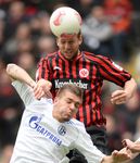 Die allerdings jäh unterbrochen wird, als Zambrano Raffael zwei Meter vor dem rechten Strafraumeck mit einer Grätsche stoppt und dafür seine zehnte gelbe Karte kassiert. Bastos will über die Vier-Mann-Mauer schlenzen, in der Aigner hochsteigt, den Ellbogen vor das Gesicht reißt und damit den Ball abwehrt. Kein Schalker moniert, aber Schiedsrichter Perl ist Pedant, Schutzhand gibt es schließlich laut Regelwerk nicht mehr. Zum Entsetzen aller Frankfurter zeigt er auf den ominösen Punkt (24). Schon wieder ist Bastos zur Stelle und zielt halbhoch ins rechte Toreck, aber Nikolov ahnt die Ecke, taucht ab und pariert! Der dritte verschossene Elfmeter des Gegners in Folge. Was Oka Nikolov, der vom Kicker-Sportmagazin zum “Mann des Spieltages“ gewählt wird, stoisch kommentiert: “Psycho gibt es nicht. Man hat schon eine Ahnung. Man entscheidet sich für eine Ecke, aber zu 90 Prozent ist es beim Elfmeter Glück.“ Dabei ist dies die Schlüsselszene des Spiels, meint nicht nur Armin Veh: “Der Elfmeter, den mein Alter gehalten hat, das war die Initialzündung für uns. Danach waren wir total im Spiel, haben uns in jeden Zweikampf reingehauen und viel Herzblut gezeigt.“ Russ ist es, der als erstes die Richtung vorgibt. Nun wollen sie es den Knappen zeigen, kombinieren zum Teil wie in der Vorrunde und unterstützen sich gegenseitig. “Wir hatten nach dem Augsburg-Spiel etwas gutzumachen. Der Trainer hat uns in die Pflicht genommen“, sagt Celozzi, der Jung auf der rechten Seite prima vertritt und sich auch im Spiel nach vorne einbringt. Zunächst flankt er Richtung Matmour, der das Leder vor den zweiten Pfosten verlängert, Aigner diesen aber ins Außennetz köpft und zwei Minuten scheitert er mit einem Schuss aus der zweiten Reihe an Torhüter Hildebrand (30.). Klasse, wie die Eintracht jetzt auf die Führung drängt, doch plötzlich kontert Schalke nach einem Ballverlust von Matmour. Bastos spielt auf Marica, der Zambrano auf halbrechts mit einer Körpertäuschung stehen lässt und allein vor Nikolov auftaucht. Der Rumäne versucht aus acht Metern den Tunnel, doch Oka bleibt eiskalt und pariert (37.).