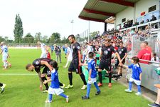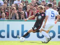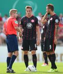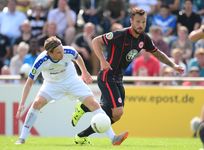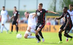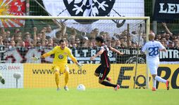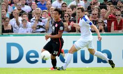 | Bericht und Fotos von www.eintracht.de: Die Eintracht zieht nach einem souveränen 3:0 (1:0) gegen den Bremer SV in die zweite Runde des DFB-Pokals ein. Castaignos (31.), Aigner (51.) und Waldschmidt (71.) trafen für die SGE. Für das erste Pflichtspiel der Saison reiste die Eintracht in den Norden der Republik zum Bremer SV. Um die erste Runde des DFB Pokals zu überstehen, schickte Armin Veh eine ähnliche Formation wie bereits eine Woche zuvor bei der Saisoneröffnung gegen den F.C. Tokyo auf das Spielfeld. Anstelle des angeschlagenen David Abraham rückte Carlos Zambrano in die Innenverteidigung. Vorne konnte der wiedergenesene Luc Castaignos neben Haris Seferovic stürmen. Knapp 2.000 Frankfurter begleiteten die SGE zum Sportpark am Vinnenweg. Von der Atmosphäre war es daher ein halbes Heimspiel für die Adler. Erste Hälfte: Verdiente Führung durch Castaignos Gegen den hochmotivierten Fünftligisten war das Gebot der Anfangsphase, Ruhe ins Spiel zu bringen. Elf Minuten dauerte es, bis die Eintracht erste offensive Akzente in Form eines Torschusses durch Haris Seferovic aus knapp zwanzig Metern setzen konnte. Der Bremer Keeper Ahlers-Ceglarek hatte jedoch keine großen Probleme, den Schuss des Schweizers zu parieren. Kurz darauf versuchte es der Eintracht-Neuzugang Luc Castaignos mit dem Kopf, verfehlte das Tor aber knapp (13.). Nach einer Viertelstunde hatte Castaignos dann die erste ganz dicke Chance des Spiels: Nach einer Standardsituation flog der Ball halbhoch auf den Stürmer zu, der mit dem rechten Knie nicht kontrolliert abschließen konnte. Im weiteren Verlauf der ersten Halbzeit nahm die SGE das Heft des Handelns in die Hand. Gegen die eng gestaffelte Bremer Abwehr fehlte es aber oftmals an den notwendigen Überraschungsmomenten. So dauerte es 28 Minuten, bis der Ball das erste Mal im Netz zappelte. Leider stand Seferovic bei seinem Kopfball in einer Abseitsposition, so dass der Treffer nicht zählte. Drei Minuten später stand Castaignos nach einem Pass aus dem Mittelfeld von Stefan Reinartz besser. Der Frankfurter Neuzugang fackelte nicht lange und hämmerte den Ball direkt an den rechten Innenpfosten, von wo aus dieser ins Tor sprang (31.). Endlich, die verdiente 1:0-Führung für die Eintracht! In der 41. Minute hatte Seferovic nach einem Querschläger von Boris Koweschnikow das zweite Tor auf dem Fuß. Der Volleyschuss des Schweizers ging jedoch leider direkt auf Ceglarek, der den Ball wegfausten konnte. Kurz vor dem Halbzeitpfiff war es wieder Seferovic, der einen Kopfball an die Latte setzte (45.). Mittlerweile hatten die Adler Pech, dass es nach 45 Minuten nur 1:0 aus Sicht der Eintracht stand. Die Führung zur Halbzeit war natürlich verdient, auch wenn es sich nicht um einen beruhigenden Spielstand handelte. Die Gastgeber aus Bremen schlugen sich tapfer und versuchten mutig nach vorne zu spielen, wenn sich Möglichkeiten ergaben. Zweite Häfte: Aigner und Waldschmidt machen den Sack zu Kurz nach dem Anpfiff hatte Seferovic eine Riesenchance, die Führung auf zwei Tore auszubauen. Nach feinem Zuspiel von Marc Stendera wollte Seferovic den Ball mit dem Außenrist ins Tor schieben, verzog aber aus kurzer Distanz (46.). Somit blieb es zunächst einmal beim 1:0. Dieser Spielstand hielt weitere fünf Minuten, bis Stefan Aigner das 2:0 für die Eintracht besorgte. Nach zwei verunglückten Schussversuchen von Reinartz und Inui im Sechzehner landete der Ball bei Aigner, der aus stark abseitsverdächtiger Position abstaubte (51.). Sei’s drum, durch die Zwei-Tore-Führung wurden die Zweifel an einem Weiterkommen in die zweite Runde immer kleiner. Die Bremer kamen nun nicht mehr gefährlich vor das Tor von Heinz Lindner. An dem heißen Sommertag wurden nach einer Stunde auch mehr und mehr die konditionellen Unterschiede zwischen dem Amateur-Team aus Bremen und den Profis aus Frankfurt sichtbar. In der 59. Minute wäre Stefan Reinartz auch fast zu seinem ersten Pflichtspieltreffer für die Eintracht gekommen. Der Mittelfeldmann hatte eine Doppelchance, welche aufgrund zweier starker Paraden von Ceglarek nicht zu einem Tor führte. Bastian Oczipka versuchte in der 67. Minute mit einem direkten Freistoß die Führung weiter auszubauen. Der auf das Towarteck gezogene Ball ging jedoch knapp über das Tor. Nachdem der in der Zwischenzeit eingewechselte Luca Waldschmidt das 3:0 erzielte, glaubte endgültig niemand im Stadion mehr an eine Pokalsensation. Seferovic blockte den Weg schön für den Youngster frei, der überlegt mit der Innenseite einschob (71.). Zwölf Minuten vor Schluss kam es dann zu einer kniffligen Torraumszene im Frankfurter Strafraum. Nach einem Laufduell mit Oczipka kam Kurkiewicz im Sechzehner zu Fall, die Pfeife von Schiedsrichter Thorsten Schriever blieb jedoch stumm. In den Schlussminuten ließen die Adler nichts mehr anbrennen und brachten den Sieg überlegt nach Hause. Fazit: Zusammenfassend war es ein souveräner Sieg der Eintracht gegen einen unangenehmen Gegner. Der Bremer SV schlug sich wacker gegen die Frankfurter und kann stolz auf seine Leistung sein. Stimmen zum Spiel Klaus Gelsdorf, Trainer des Bremer SV: „Wir sind mit dem Ergebnis sehr zufrieden. Als Fünftligist 0:3 gegen einen Bundesligisten zu verlieren, ist in Ordnung, zumal wir uns noch in der Vorbereitung befinden. Defensiv standen wir gut, wobei uns noch ein paar Sechser gefehlt haben, die eine wichtige Rolle spielen. Dadurch waren wir in der Zentrale offen, das hat mir weniger gut gefallen. Wir haben es auch nicht geschafft, unsere Angriffe zielstrebig nach vorne zu tragen. Die sind schnell verebbt.“ Armin Veh, Eintracht-Trainer: „Unser Gegner war sehr gut organisiert. Wir haben uns die erste Viertelstunde richtig schwer getan, der Gegner hat eng gestanden und versucht, auf Konter zu spielen. Zweimal wären die Bremer damit fast durchgekommen. Danach haben wir das Spiel übernommen und die Überlegenheit, die wir als Bundesligist auch haben müssen, ausgespielt. Aus unseren 